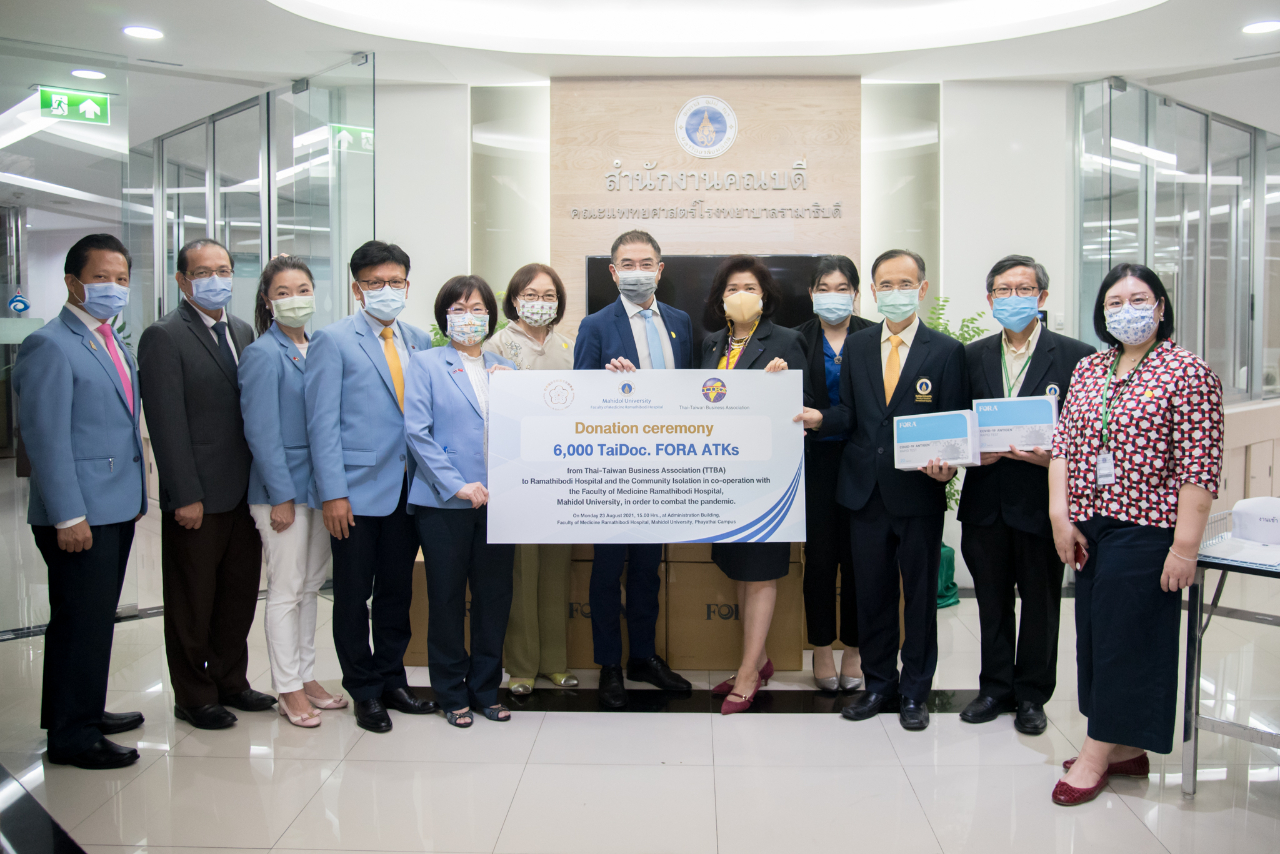 泰國台灣商會聯合總商會於本(2021)年8月23日下午赴泰國馬希敦大學(Mahidol University)所屬拉瑪鐵菩提醫院(Ramathibodi Hospital)捐贈新冠肺炎快篩試劑6,000組,由郭修敏總會長偕陳漢川監事長、張冠昌名譽總會長、楊菁萍副總會長及林根源秘書長等出席院方舉辦的捐贈儀式。院方國際副院長詩玲塔拉教授(Sirintara Singhara Na Ayudhya)主持典禮活動,駐泰國代表處副代表徐蔚民受邀出席見證。詩玲塔拉副院長致詞歡迎郭總會長等人及徐副代表與會,感謝台商總會捐贈抗原快篩試劑,曼谷疫情升高,醫院檢測能量緊繃,試劑需求迫切,台商會捐贈的臺灣製快篩試劑有助支援醫院抗疫,度過嚴峻時機。詩玲塔拉副院長感謝駐泰國代表處自2020年新冠肺炎疫情爆發以來,多次結合台灣僑民力量,共同協助醫院防疫,如去年5月,第一波疫情期間,捐贈院方防護設備及移動式超音波儀器等,提升第一線醫護人員防疫工作的安全。當前面臨第三波疫情,再次捐贈抗原快篩試劑6000組,提供院方實質的奧援。