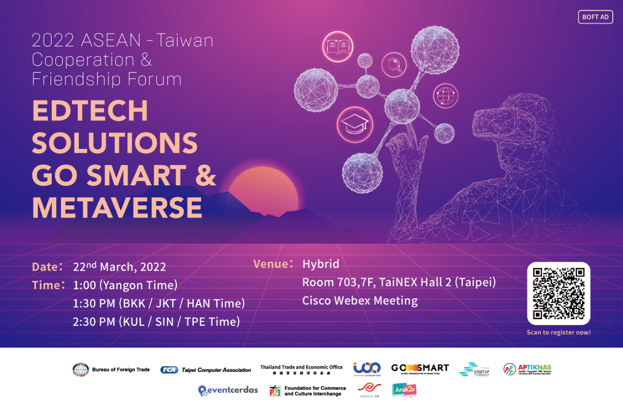 為協助有意布局新南向市場之台灣企業深入了解東協國家智慧學習發展之趨勢及元宇宙在教育發展的市場前景,開拓我國企業進入該市場的先機。由經濟部貿易局支持,台北市電腦公會主辦的「開啟東協智慧教育元宇宙新視野」針對東協智慧教育及元宇宙應用商機,邀請東協及台灣產業專家進行精闢的分享與探討,精彩可期,座位有限,千萬不可錯過,趕快手刀報名!