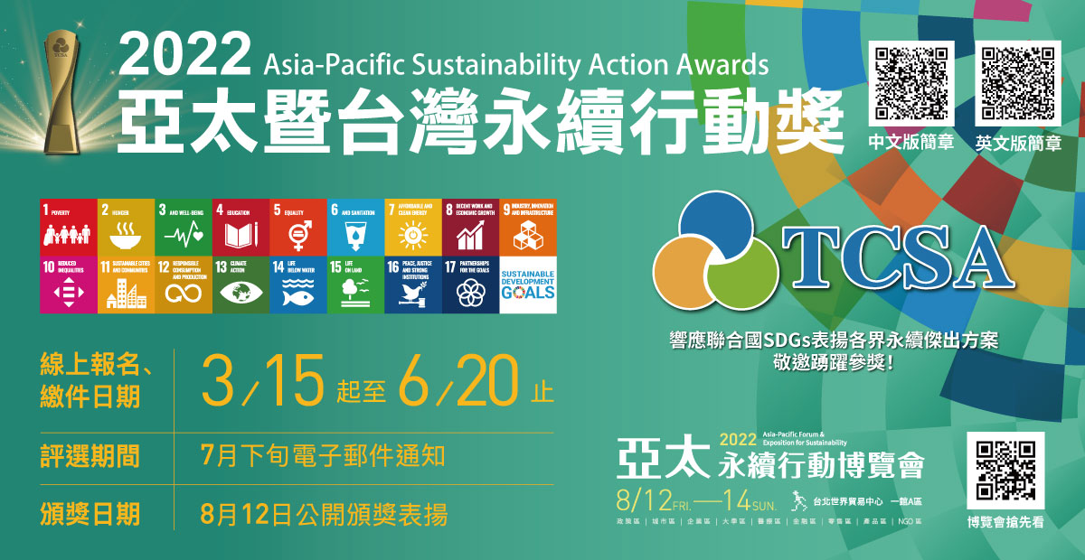 「2022 亞太暨台灣永續行動獎」旨在表揚在實踐聯合國17項永續發展目標(SDGs)具卓越成果及貢獻之企業、大學、醫院及地方政府,頒獎典禮定於8月12日結合首屆亞太永續行動博覽會暨高峰會辦理頒獎典禮,彰顯績優組織之永續發展成果。