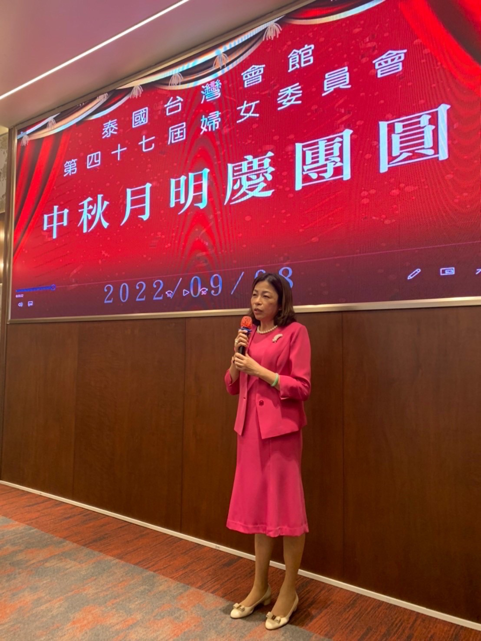 薛秀媚公使致詞表示,很榮幸受邀與眾台灣會館姊妹歡慶中秋節,泰國僑界女性人才輩出,兼顧事業與家庭,擁有自己一片天,令人佩服;僑務組許世榕組長也福大家中秋佳節愉快安康。