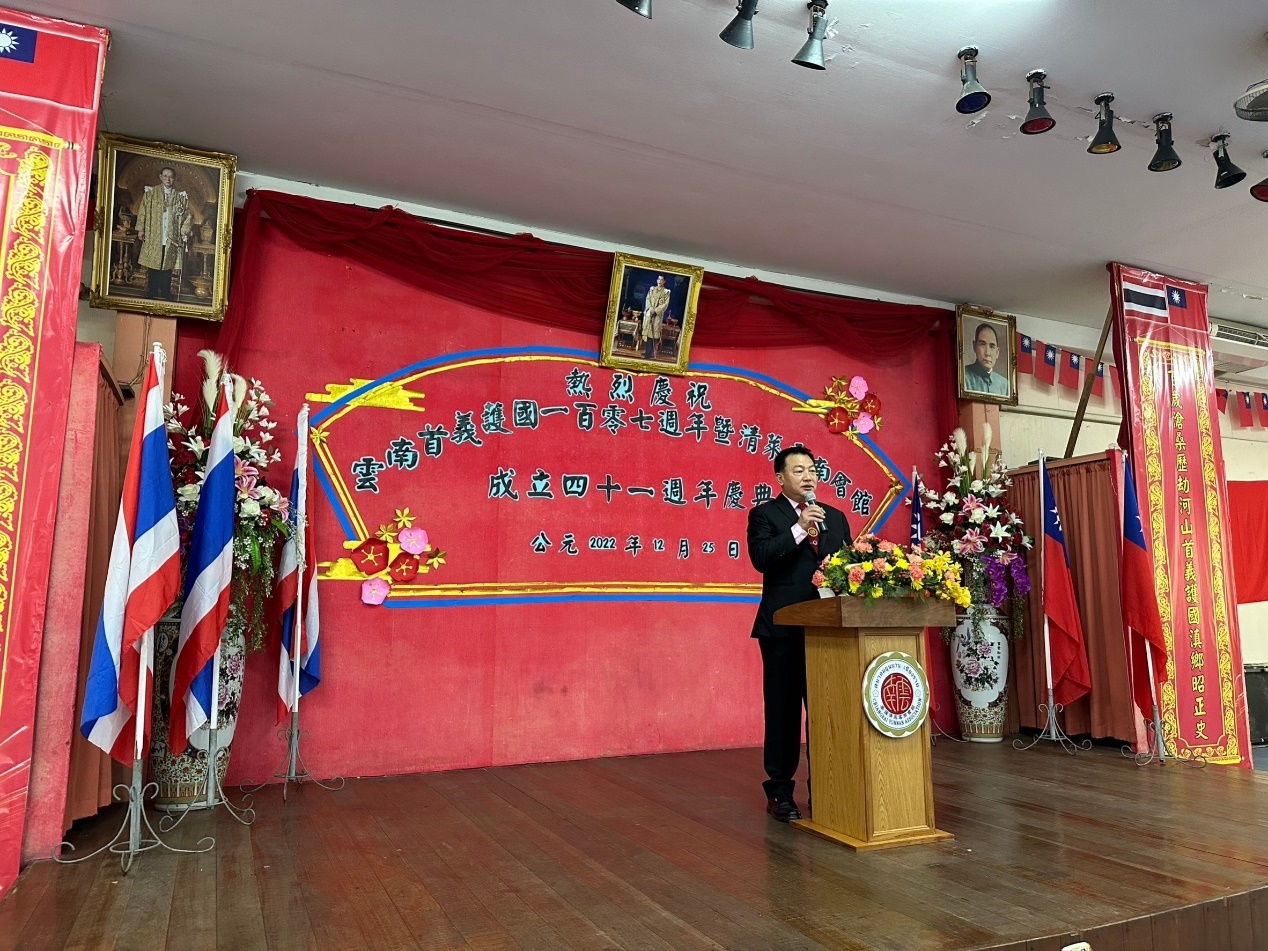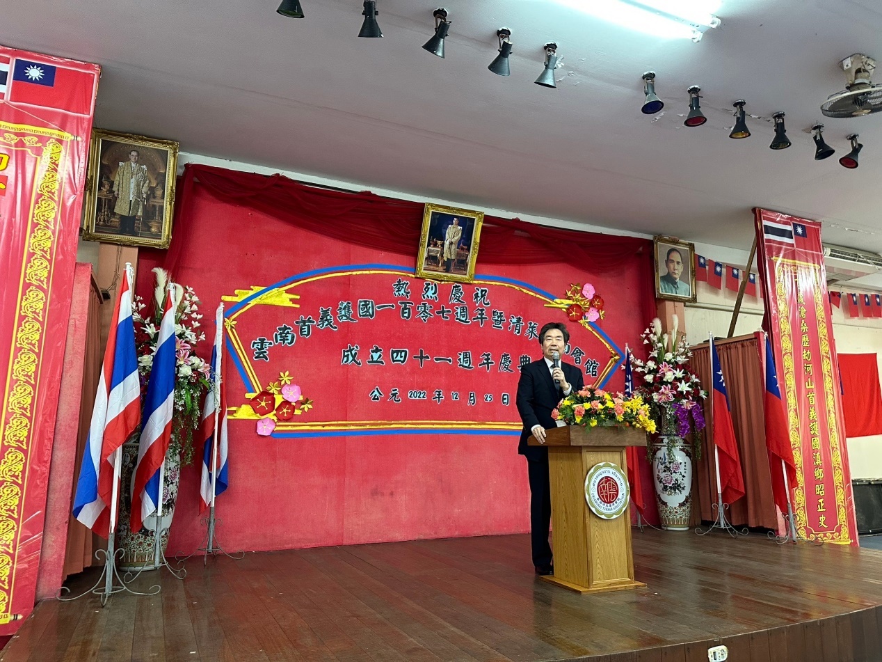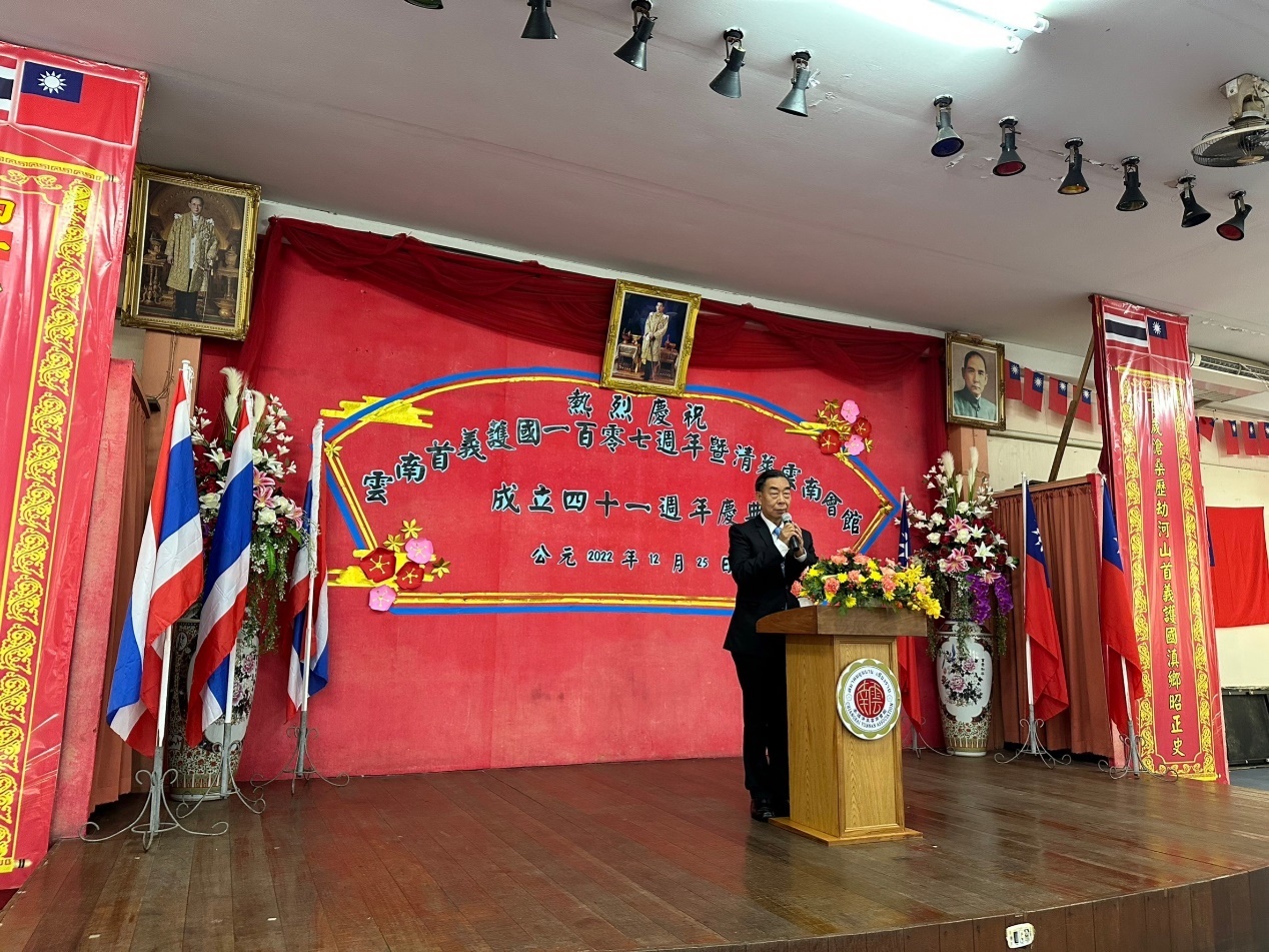 清萊雲南會館舉辦首義護國107周年紀念暨該會館41周年慶,由蔣慶國會長主持,約200位泰北僑胞踴躍參與,活動在泰國國歌和中華民國國歌聲中拉開序幕,莊大使致詞指出,紀念雲南首義護國107周年、雲南會館41周年慶和中華民國行憲紀念日具有多重意義,因為没有107年前雲南先賢組織護國軍開第一槍號召起義討袁,迫使袁世凱取消帝制,就没有今日實行民主憲政的中華民國及力行自由、民主及人權的臺灣,期盼清萊雲南會館在蔣會長的帶領下,繼續堅守民主精神,擁護中華民國支持台灣。