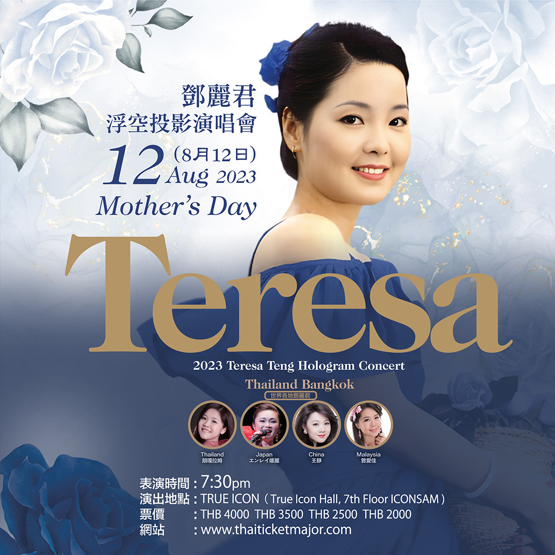 結合最新影音科技與華語音樂文化的「鄧麗君浮空投影演唱會」8月12日晚上7:30將在泰國曼谷ICON SIAM 7樓True Icon Hall舉辦,本次在泰國僅限定一場的演唱會將運用好萊塢最新浮空投影技術,讓鄧麗君小姐的身影活靈活現地展現在舞臺上,此外本次演唱會也安排四位以模仿鄧麗君聞名的歌手,包含王靜、朗嘎拉姆、曾愛佳、媛麗等同臺演出,精彩的表演節目不容錯過,邀請您一起來重溫鄧麗君的優雅神韻與動人歌聲,購票詳情請洽: https://www.thaiticketmajor.com/concert/teresa-teng-hologram-concert-thailand-bangkok.html