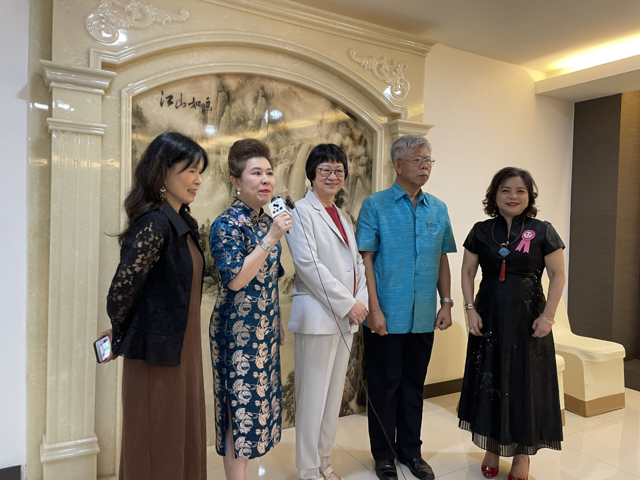 圖說三:駐泰國代表處薛秀媚公使(中)、文化組田又安組長(左一)、北欖府文化委員會主席Dr.Vichai Chancahmroon(右二)、泰國台灣會館林何佩娟主席(左二)、張玲琴副主席(右一)共同接受泰媒採訪