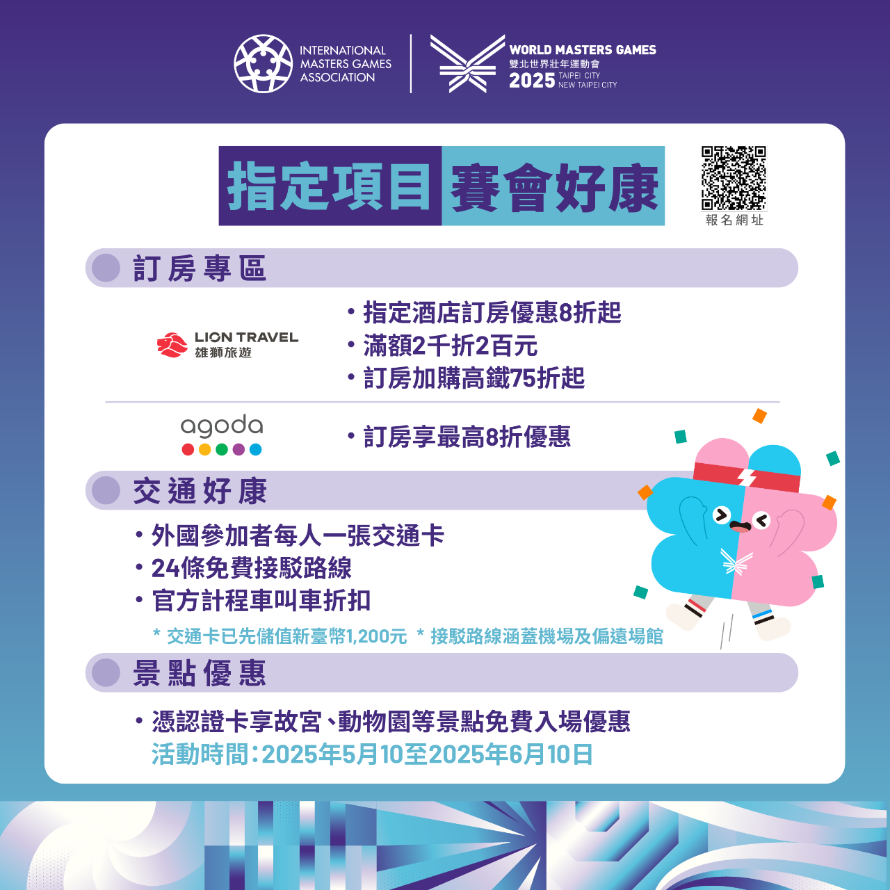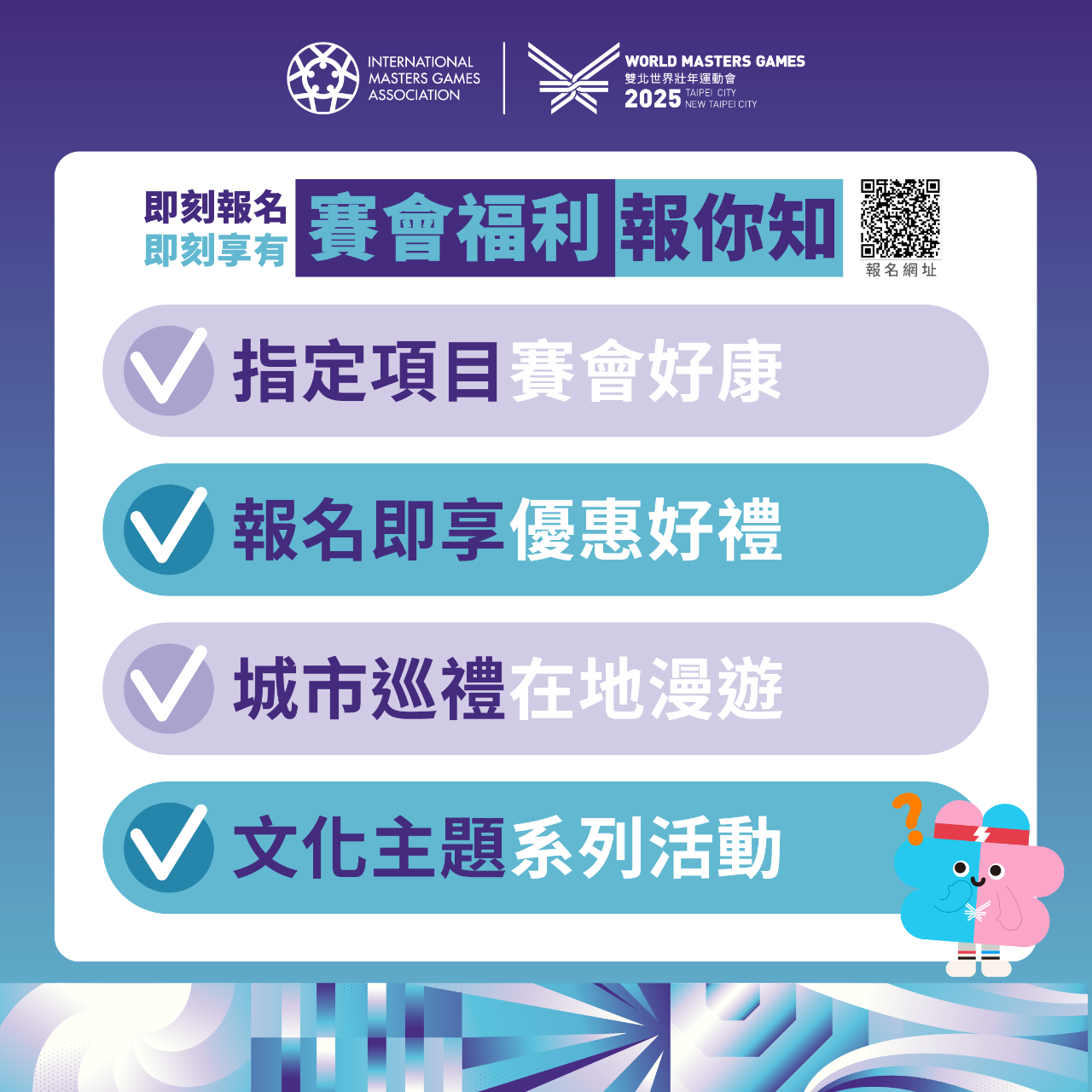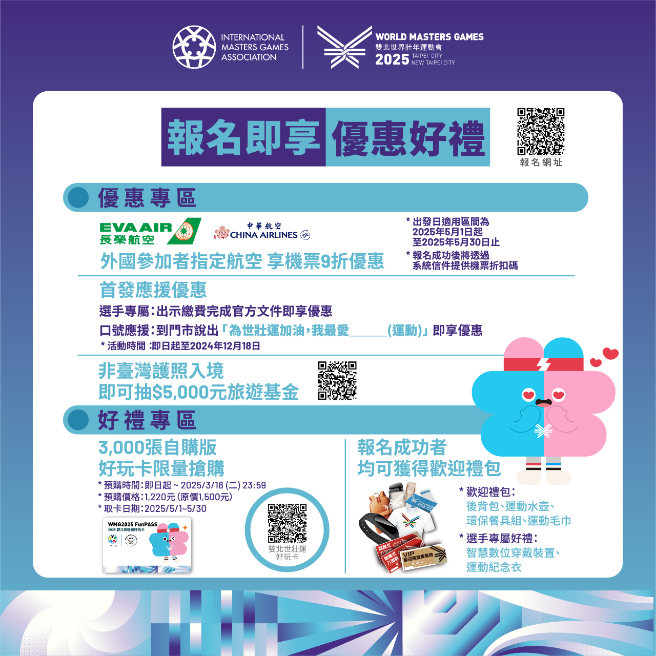更詳細的資訊 請點[賽會福利懶人包】 或官方網站(https://wmg2025.tw),即刻報名即刻享有