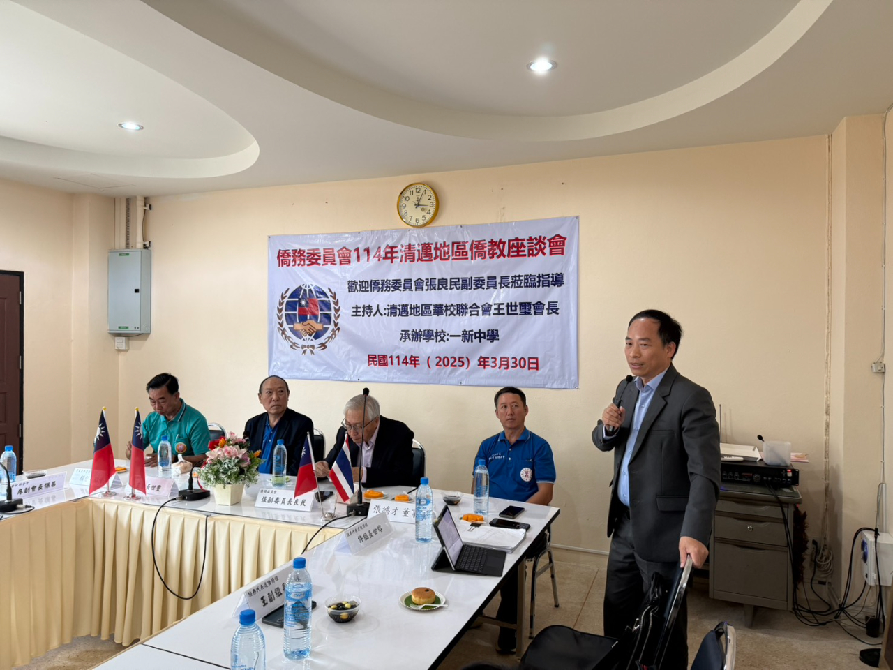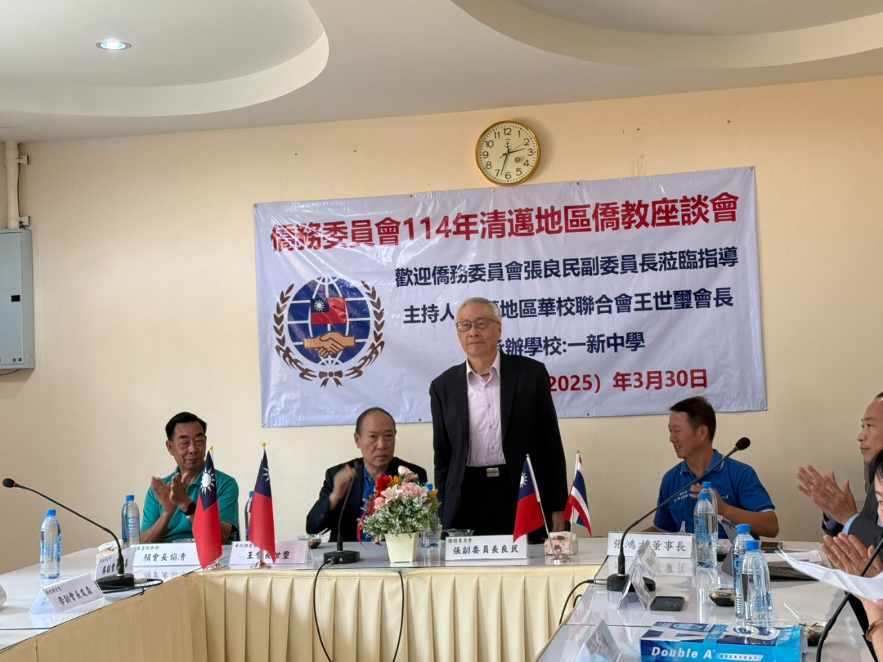 中華民國僑務委員會副委員長張良民於本(2025)年3月30日下午,在台灣駐泰代表處僑務組許世榕組長、王懷德副組長陪同下,前往清邁熱水塘一新中學參訪,並於該校舉辦「泰北地區僑教座談會」,與清邁華校聯合會及當地多所僑校校長、師長深入對話,了解基層教學需求與僑生升學情況。