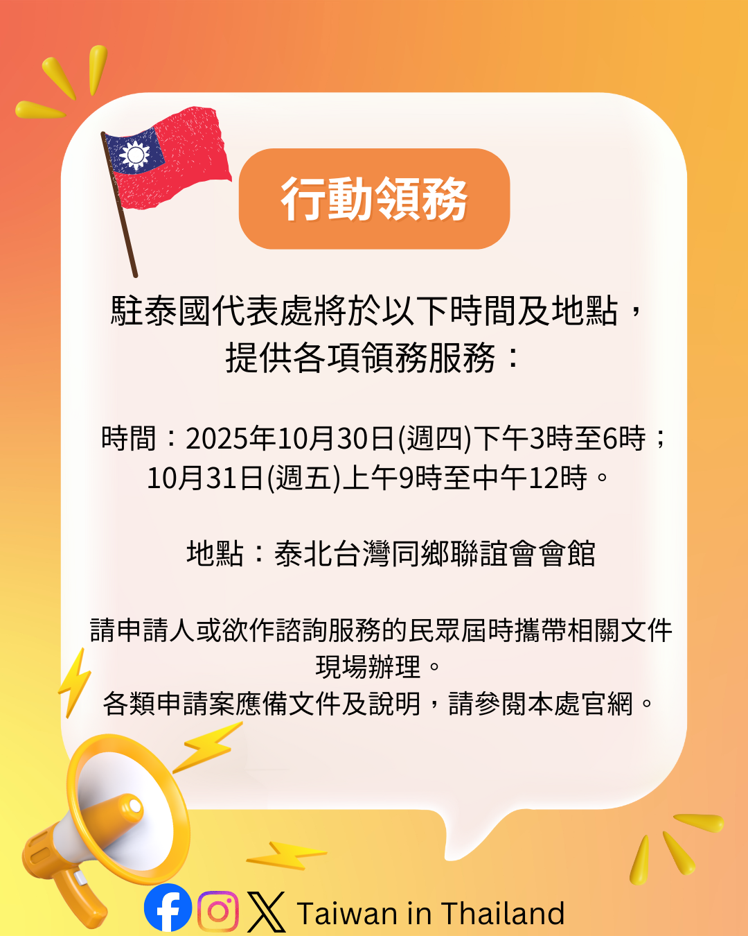 (2)2025年10月31日(週五)上午9時至中午12時,在【泰北台灣同鄉聯誼會會館】