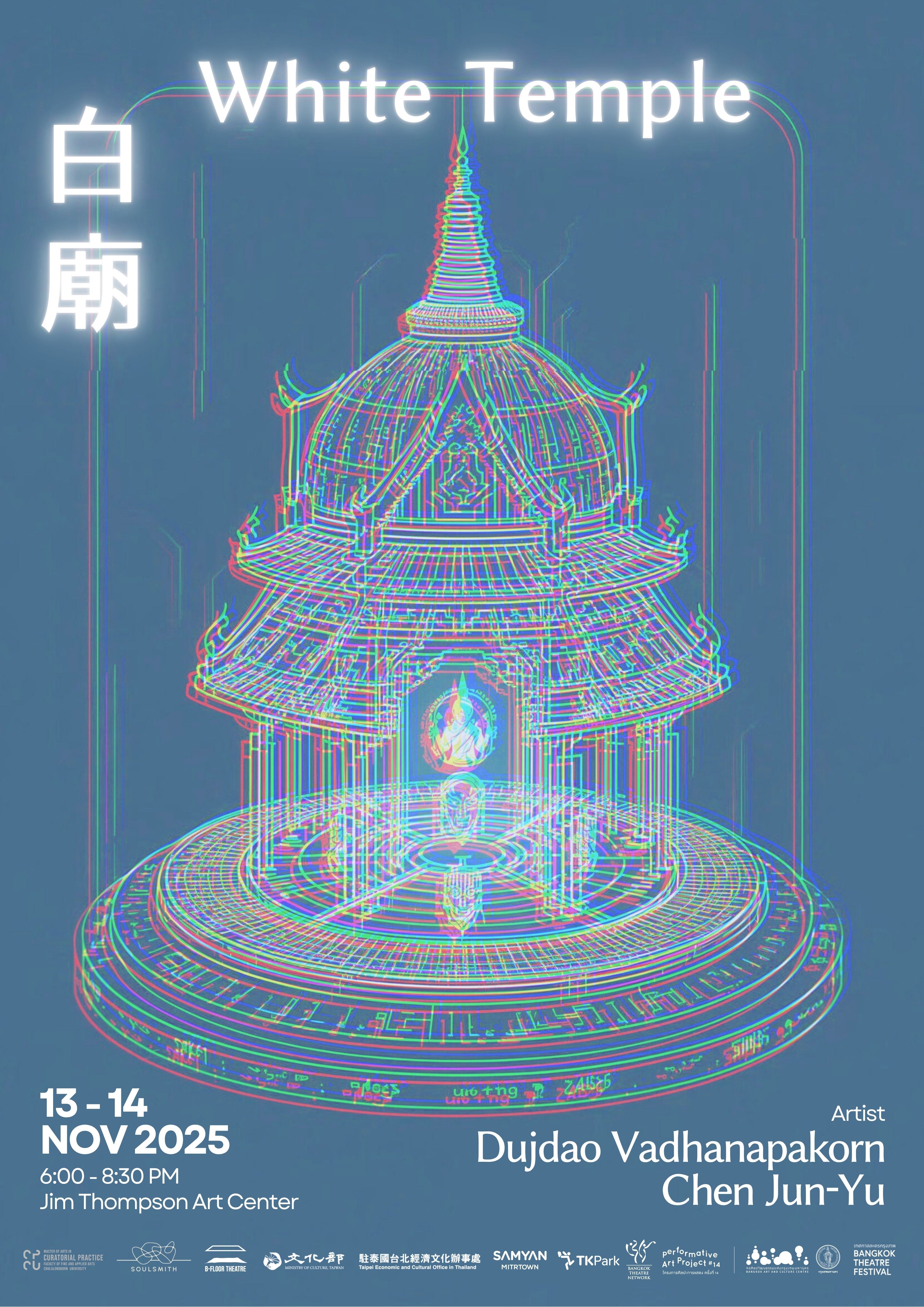 臺灣藝術家陳俊宇(Chen Jun-Yu)與泰國藝術家 Dujdao Vadhanapakorn 共同創作的行為藝術作品《White Temple白廟》,自本(2025)年11月13日至14日在泰國曼谷金湯普森藝術中心(Jim Thompson Art Center) 演出兩場。