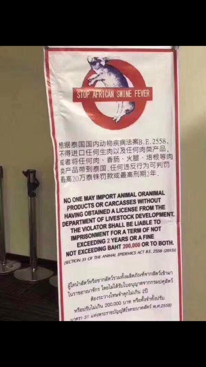 泰國政府日前發布公告,為因應中國非洲豬瘟疫情,任何生肉以及任何肉類產品倘未依規定於輸入前取得進口許可證均不得進口,同時禁止旅客將任何肉、香腸、火腿、培根等肉類產品帶到泰國,違者將處以最高20萬泰銖罰鍰或(及)最高兩年有期徒刑。