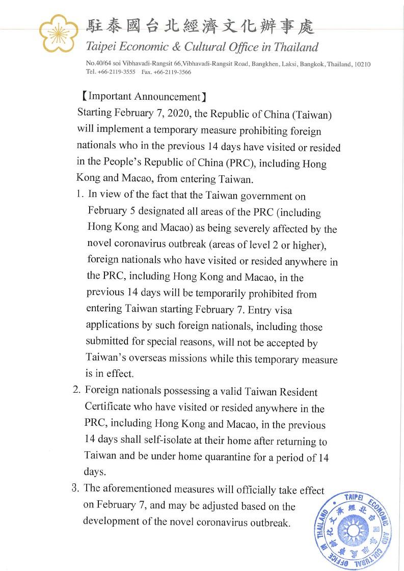 Starting February 7, 2020,the Republic of Chin... - Taipei Economic and Cultural Office in Thailand 駐泰國台北經濟文化辦事處 ::: Skip to main content