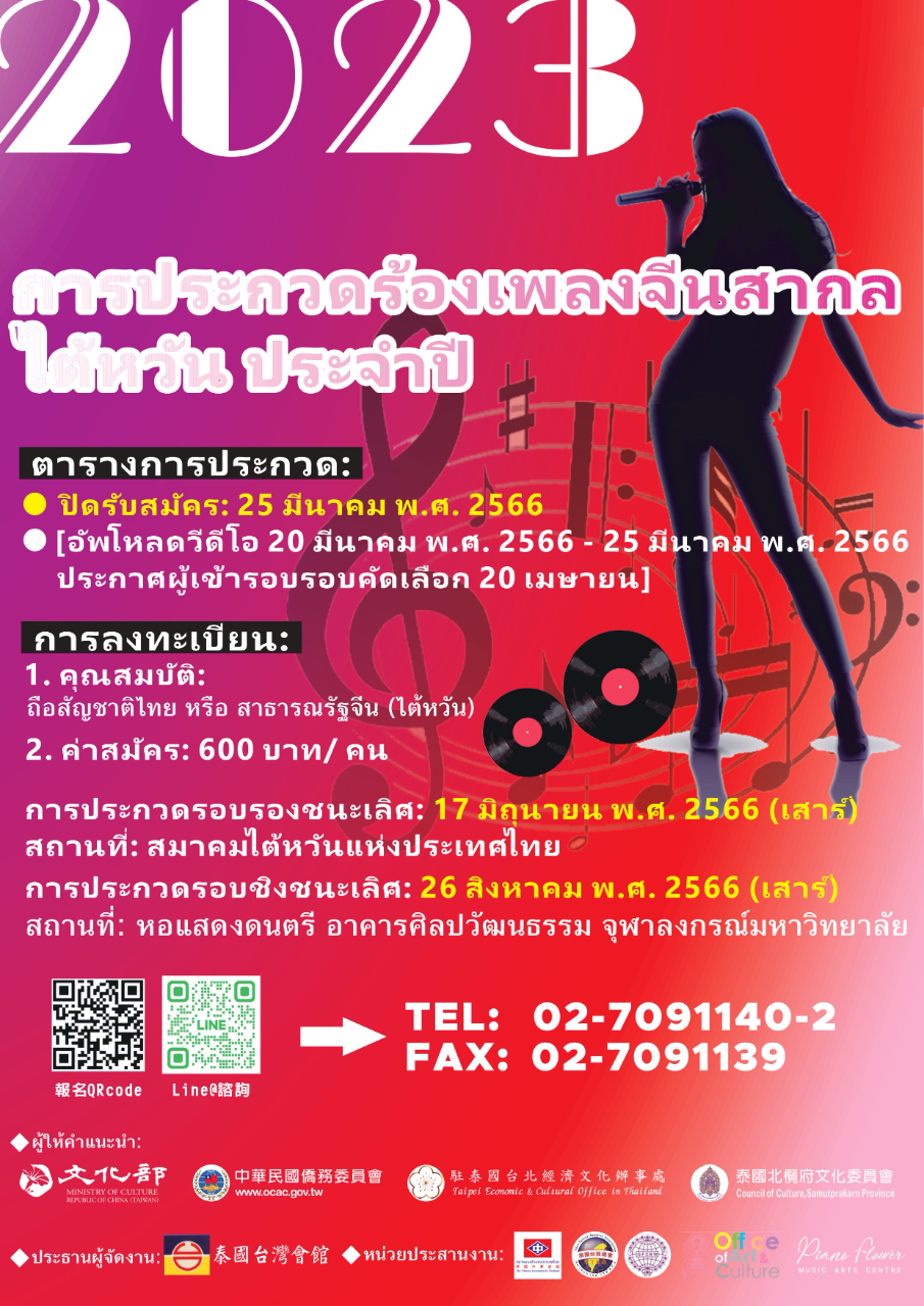 ในปีนี้ทางสมาคมไต้หวันแห่งประเทศไทย ภายใต้การแนะแนวจากกระทรวงวัฒนธรรม สาธารณรัฐจีนไต้หวัน คณะกรรมการกิจการชาวจีนโพ้นทะเลสาธารณรัฐจีน (ไต้หวัน) สำนักงานเศรษฐกิจและวัฒนธรรมไทเปประจำประเทศไทย และสำนักงานวัฒนธรรมจังหวัดสมุทรปราการ ได้จัด “การประกวดร้องเพลงจีนสากลไต้หวันปี 2023” ขึ้นอีกครั้งเพื่อเป็นการส่งเสริมวัฒนธรรมเพลงยอดนิยมของไต้หวันอย่างต่อเนื่อง