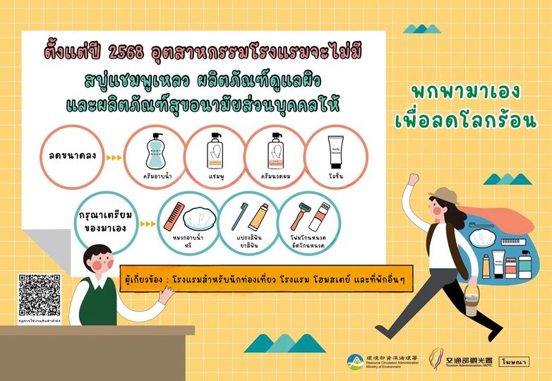 ตั้งแต่วันที่ 1 มกราคม 2568 เป็นต้นไป รัฐบาลไต้หวันมีมาตรการ “ห้ามใช้บรรจุภัณฑ์แบบใช้แล้วทิ้ง” ซึ่งกำหนดให้โรงแรมต่าง ๆ ยกเลิกแจกผลิตภัณฑ์อาบน้ำที่บรรจุในขวดขนาดเล็กกว่า 180 มิลลิลิตร โดยเน้นให้ใช้ขวดขนาดใหญ่แทน ทั้งยังงดวางอุปกรณ์ต่าง ๆ เช่น แปรงสีฟันและยาสีฟันตามห้องพักอีกด้วย