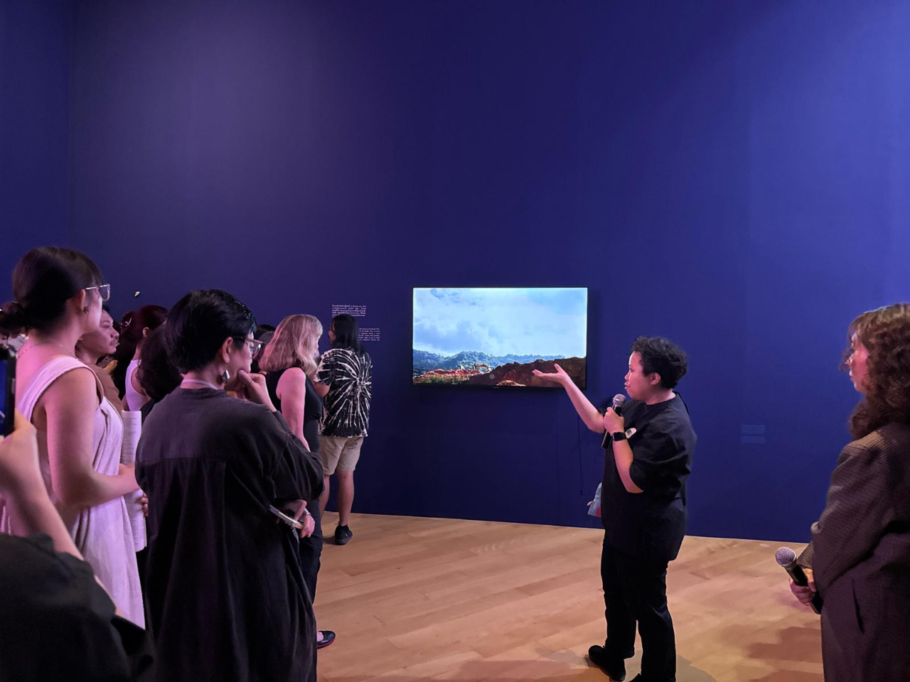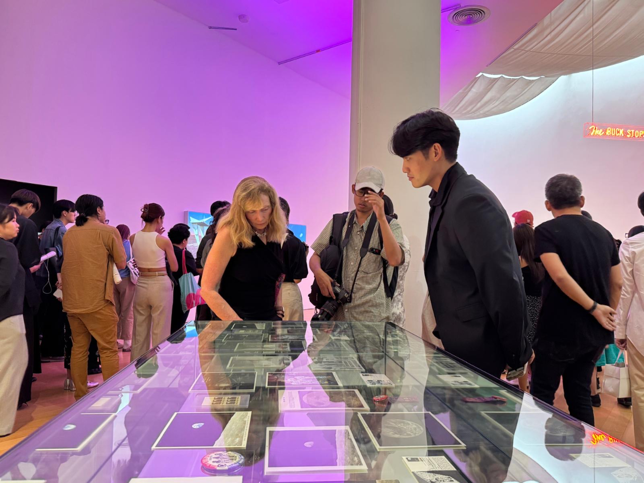 กฤติยา กาวีวงศ์ ภัณฑารักษ์ (แถวหลังคนที่ 6 จากซ้าย) จุน ยัง ศิลปิน (แถวหลังคนที่ 4 จากซ้าย) อู ซาว ยี ศิลปิน (แถวหน้าคนที่ 3 จากซ้าย) พินรี สัณฑ์พิทักษ์ ตัวแทนจากมูลนิธิเจมส์ เอช ดับเบิลยู ทอมป์สัน (แถวหน้าคนที่ 2 จากซ้าย) ฉัตรวิชัย พรหมทัตตเวที รองประธานกรรมการมูลนิธิหอศิลปวัฒนธรรมแห่งกรุงเทพมหานคร (แถวหน้าคนที่ 1 จากซ้าย) อดุลญา ฮุนตระกูล ผู้อำนวยการหอศิลปวัฒนธรรมแห่งกรุงเทพมหานคร (แถวหลังคนที่ 5 จากซ้าย) กุ้ย เย่ ฉิน ผู้อำนวยการฝ่ายวัฒนธรรม สำนักงานเศรษฐกิจและวัฒนธรรมไทเป ประจำประเทศไทย (แถวหลังคนที่ 1 จากขวา) ถ่ายรูปรวมกับศิลปินที่เข้าร่วมโครงการในพิธีเปิดนิทรรศการ