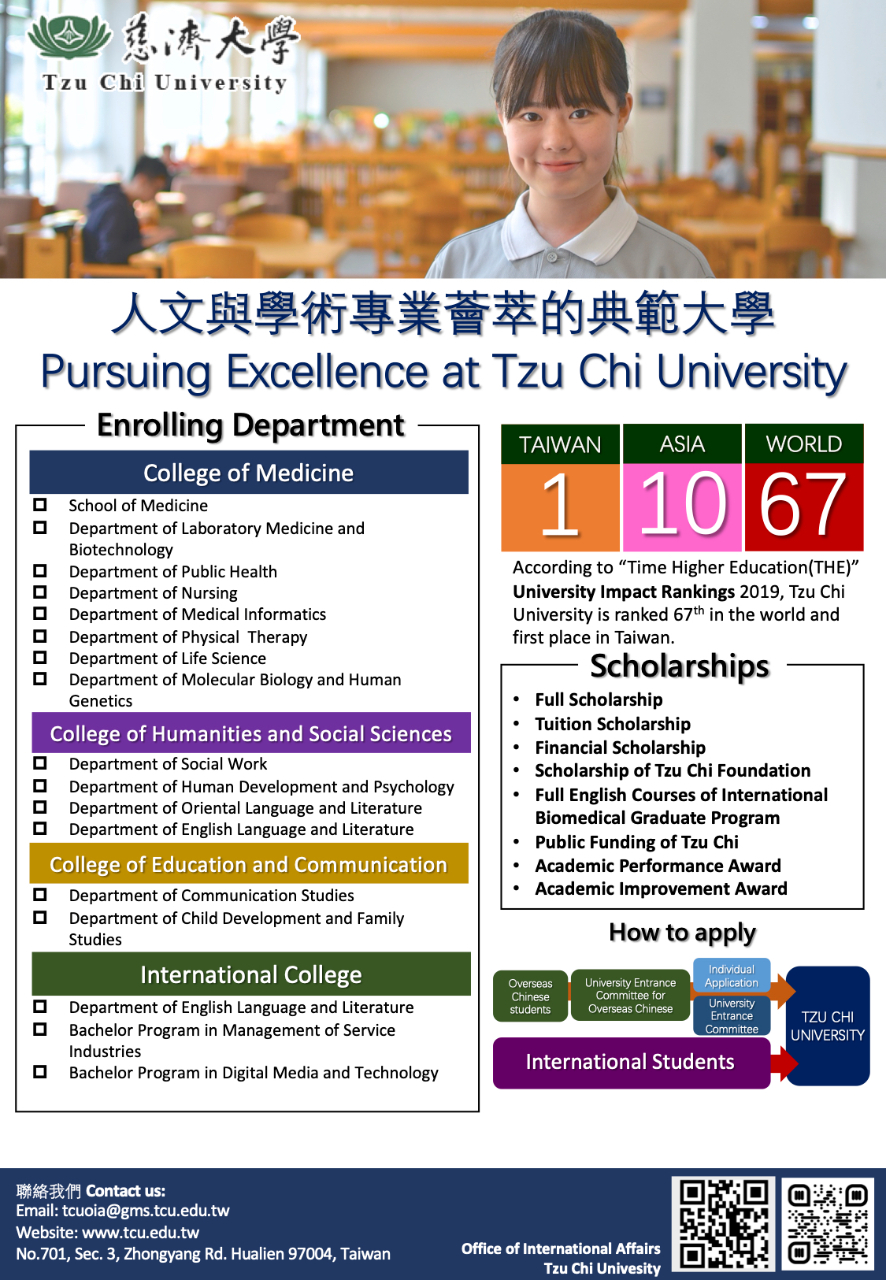 Tzu Chi University offers a wide range of undergraduate, master's, and Ph.D. programs, to international students, through four colleges, namely the College of Medicine, College of Education and Communication, College of Humanities and Social Sciences, and International College, as well as our departments/institutes/centers. You may access Tzu Chi University’s website for available programs.