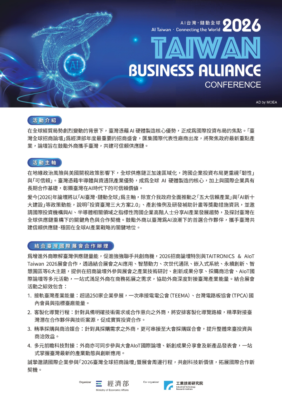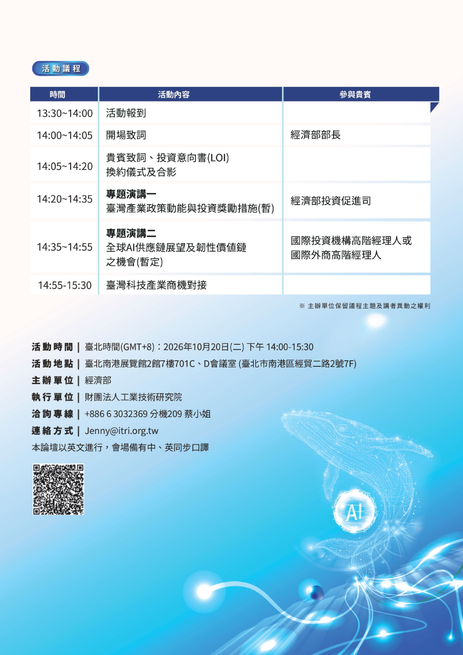 活動時間 | 2025年10月20日(二)下午14:00-15:30 活動地點 | 臺北南港展覽館2館7樓701C、D會議室 (臺北市南港區經貿二路2號7F) 主辦單位 | 經濟部 執行單位 | 財團法人工業技術研究院 洽詢專線 | +886-6-3032369分機209 蔡小姐 連絡方式 | Jenny@itri.org.tw 本論壇以英文進行,會場備有中、英同步口譯