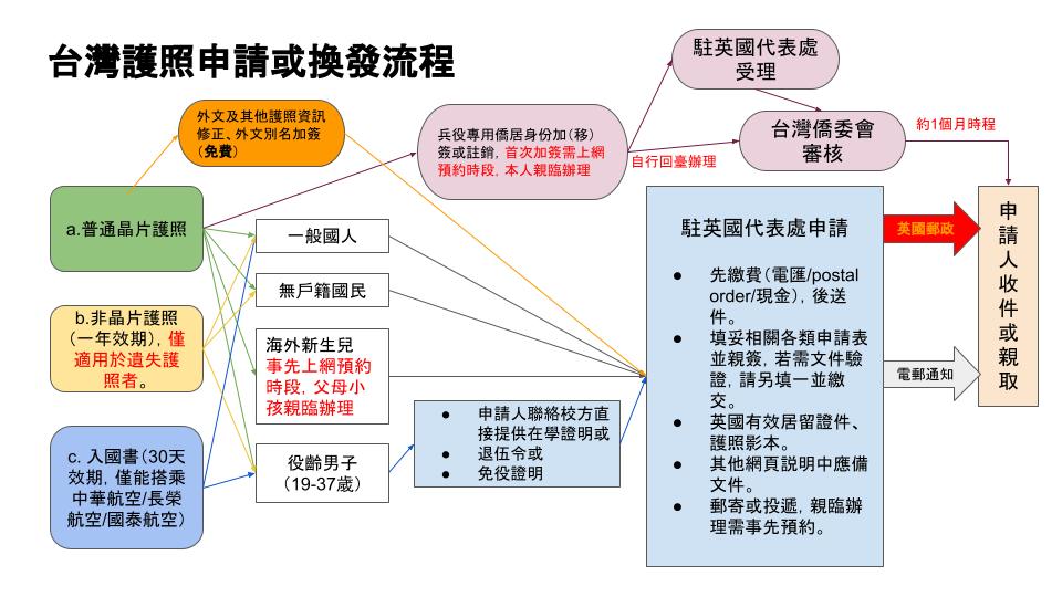 ♦2024年1月1日起放寬無戶籍國民(護照上無身分證字號者)入台規定,詳情請參閲移民署公告: 入出國及移民法-新制說明 (中文版) (English Version) *在台預定停留3個月以內: 1.持我國有效晶片護照及回程或次一目的地之機(船)票者,可以不用申請「臨人字入國許可」,僅憑護照入境。(因違反法令遭禁止入國者於管制期間不適用) 2.持我國有效非晶片護照及回程或次一目的地之機(船)票者,可於抵達機場時向移民署機場櫃臺申請「臨時入國許可證」後入境 *在台預定停留3個月以上: 需持有效「臨人字號入國許可」入境台灣 ♦中國大陸配偶「首次申請團聚」入境許可證,請先以電郵與本處預約面談時間。 面談預約請電郵至:taiwanimmigration.gbr@mofa.gov.tw |