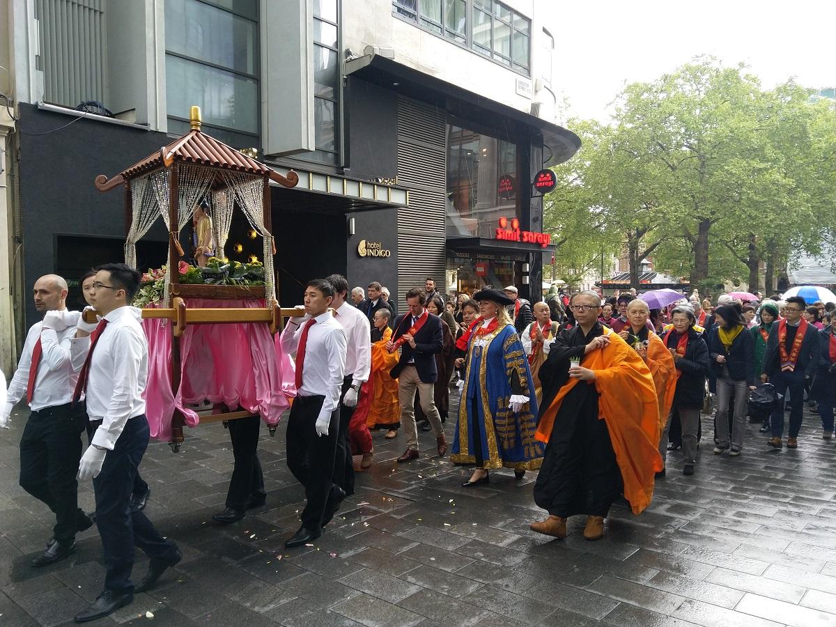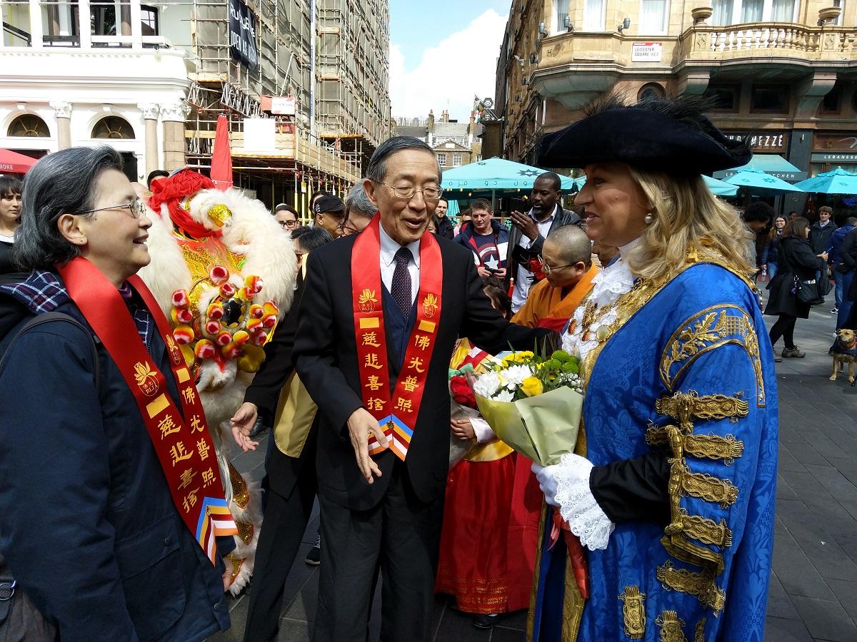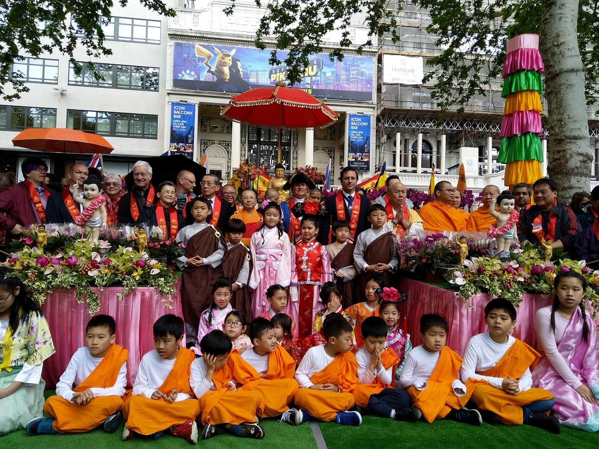 倫敦佛光山為慶祝佛祖釋迦摩尼誕生2,563年,5月11日在倫敦華埠旁萊斯特廣場(Leicester Square)舉辦浴佛節儀式。駐英國代表處林永樂大使伉儷、張希賢僑務秘書、佛光山督導倪世健僑務顧問、西敏市長Lindsey Hall勳爵、侯任市長Ruth Bush市議員、倫敦國際佛光會李柏達及社區人士近500人前來共慶,會後並繞行華埠一週,吸引大批主流及觀光客5千人駐足觀看,將臺灣佛光山入世助人、倡議和平的價值成功推廣至英國各界。