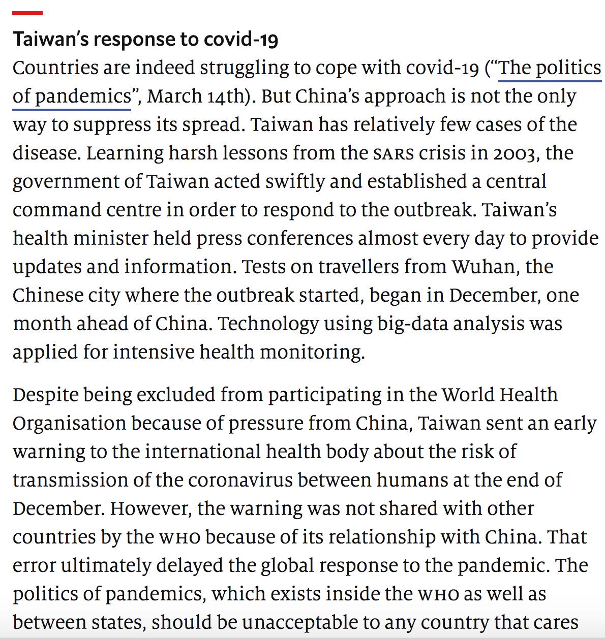 最新一期《經濟學人》刊出本處林永樂代表投書表示,台灣此次對抗新型冠狀病毒之經驗證明,不用威權國家之專制手段,民主國家仍可成功對抗疫情。比起中國專制手段,台灣是管理流行疾病更好之民主模式。