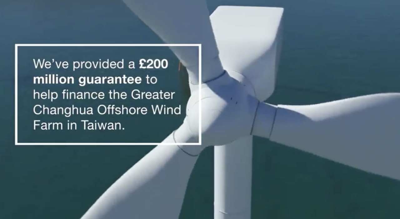 根據英國出口信貸局發布的新聞稿,UKEF提供 2億英鎊(約新台幣78億元)融資信用擔保給大彰化東南離岸風力發電計畫(Greater Changhua 1 Offshore Wind Farm)新投資者,開啟英國離岸風電產業的出口潛能。英國業者希捷斯海事工程(Seajacks)與特瑞堡應用科技(Trelleborg)參與大彰化東南離岸風電計畫。