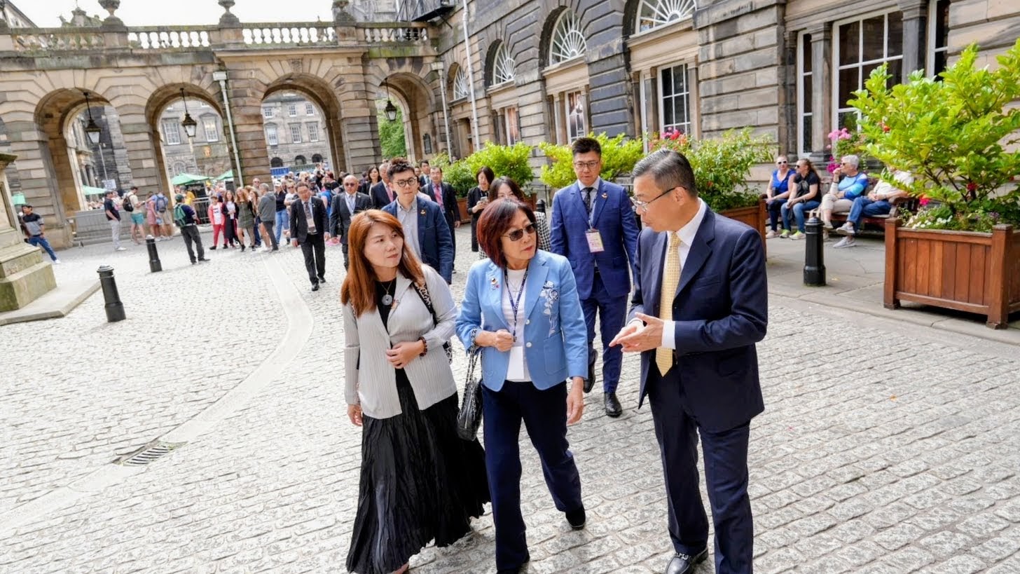此次拜會地點為座落於愛丁堡歷史悠久「皇家一哩路」(Royal Mile)上的市政廳,由愛丁堡市議會議員Cammy Day、James Dalgleish以及議會團隊熱情接待。康議長致詞時表示,很高興在藝術節期間造訪愛丁堡,看到街頭各類型藝術家生動活潑的演出,滿街人山人海來自各國的觀光客,深刻喜愛這個城市的氛圍。愛丁堡在淨零排碳、觀光文化推廣、智慧城市治理等政策方面具有高度執行力與創新作為,極具借鏡價值。