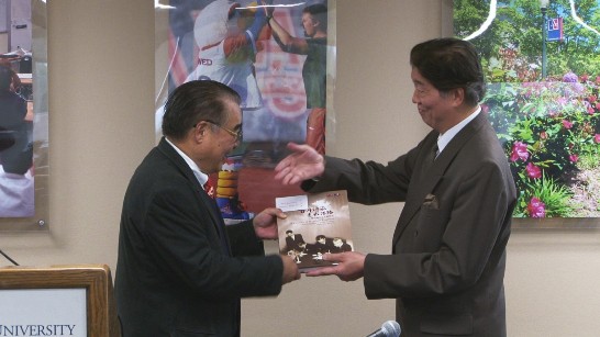 沈代表於演講前,致贈美利堅大學亞洲研究計畫研究委員會主任趙全勝教授其參與編撰之「百年傳承 走出活路:中華民國外交史料特展」乙冊。