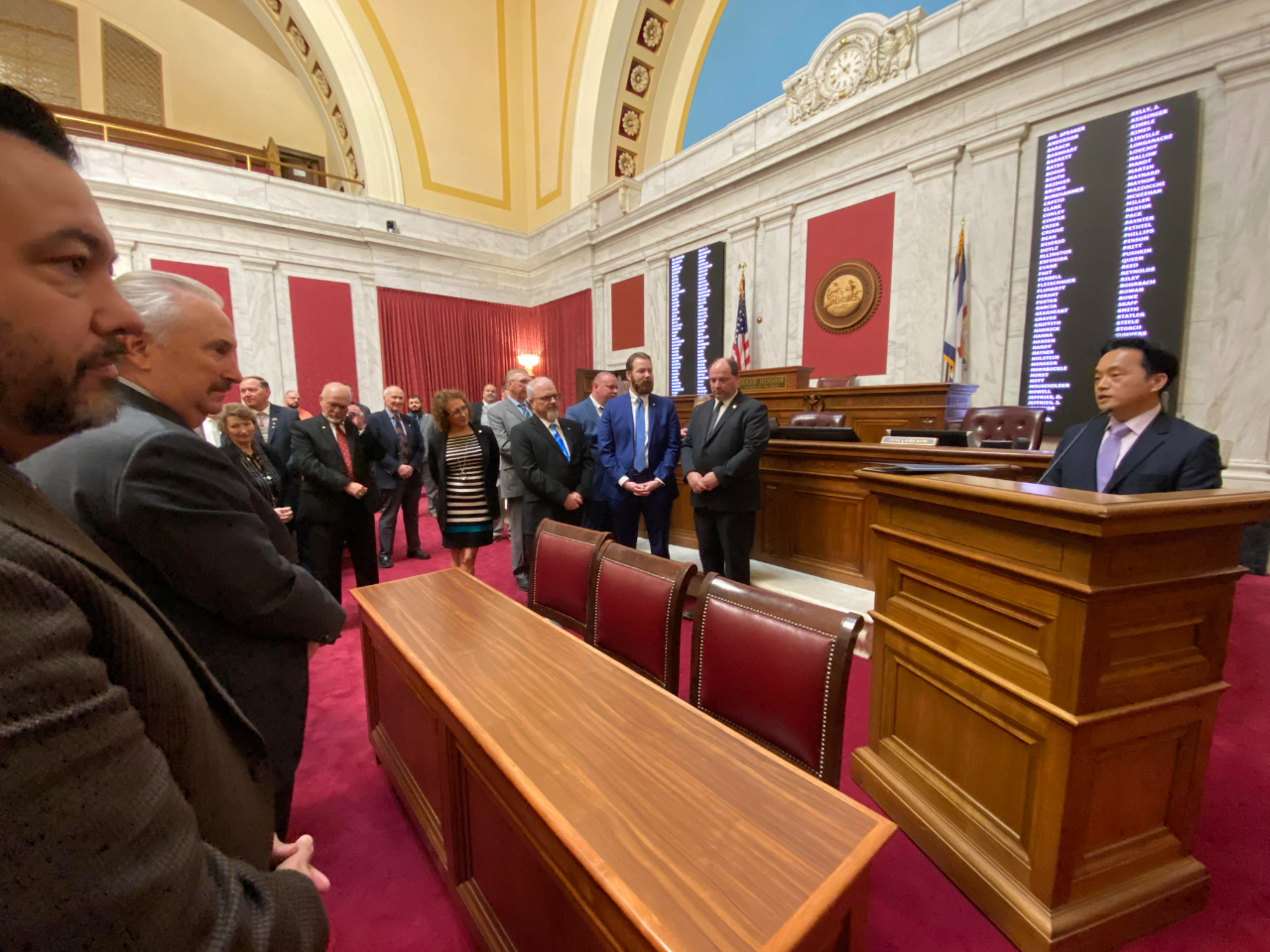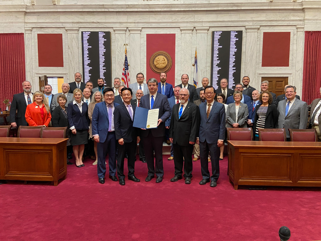 為展現與台灣的友好情誼,西維州參眾兩議會特別邀請駐美國代表處鄭公使榮俊乙行出席觀禮並致詞,續由參議會議長兼副州長Criag Blair及眾議會議長Roger Hanshaw親致決議案精裝本。