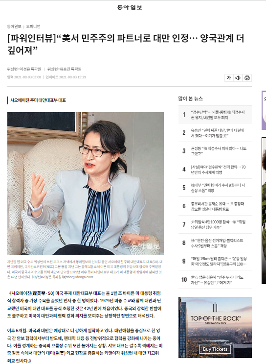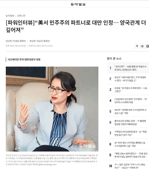 本處蕭大使在東亞日報之專訪於2021年8月3日刊登 - 駐美國台北經濟文化代表處 Taipei Economic and Cultural Representative Office in the United States ::: 跳到主要內容區塊