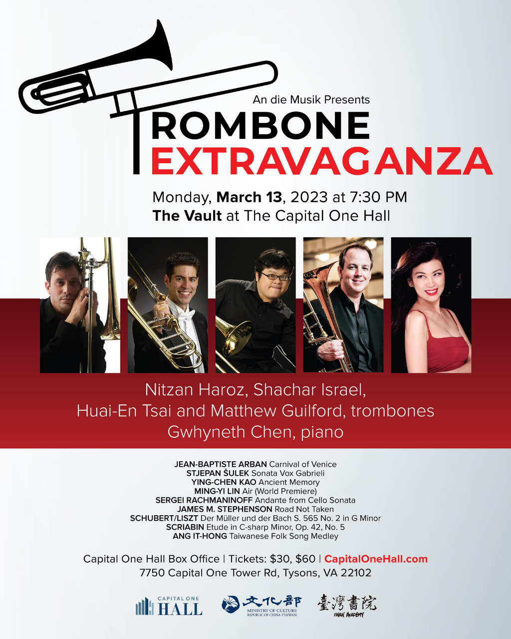 中華民國駐美國代表處與巴爾地摩「An die Musik Live」合作,邀請台灣鋼琴家陳毓襄以及長號演奏家蔡懷恩,聯合來自費城交響樂團的以色列長號演奏家Nitzan Haroz、克利夫蘭管弦樂團的以色列長號演奏家Shachar Israel以及美國國家交響樂團低音長號演奏家Matthew Guilford,將於本(2023)313(星期一)晚間730分,在Capital One HallVault演奏廳舉辦長號嘉年華音樂會,相信這樣國際大師級的組合,將為大家帶來與眾不同的音樂饗宴!
