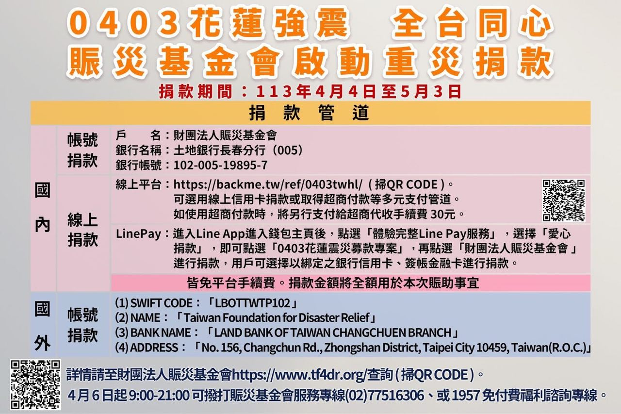 0403花蓮震災中央捐款專戶帳號相關資訊