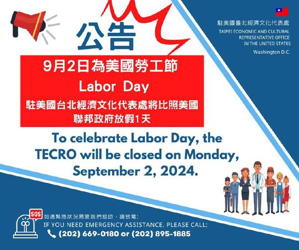 本(2024)年9月2日(星期一)為美國勞工節,本處該日休假,屆時領務櫃台將暫停服務。如遇緊急狀況需本處協助,請致電(202) 669-0180或(202)895-1885辦理。