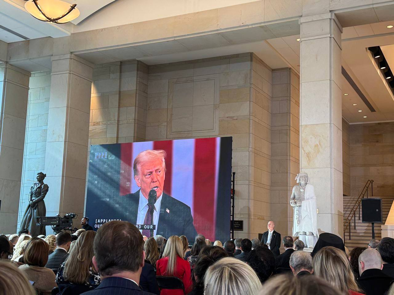 受到嚴峻低溫天候影響,川普總統當選人本(1)月17日宣布取消戶外現場觀禮,將就職典禮移至國會大廈圓頂大廳(Capitol Rotunda)舉行;由於場地空間限制必須大幅限縮現場觀禮人數,籌辦單位「就職典禮國會聯合委員會」(Joint Congressional Committee on Inaugural Ceremonies, JCCIC)安排其他特別賓客在國會大廈內另一大廳透過轉播觀禮,川普總統於圓頂大廳的就職典禮結束後,也親自來到現場致意,並向與會貴賓發表談話。我國駐美代表第二度受JCCIC正式邀請出席,另外在駐美處的積極安排下,韓院長也順利出席國會觀禮,參與美國最重要的民主盛會,彰顯台美堅實穩固的夥伴關係與友誼。