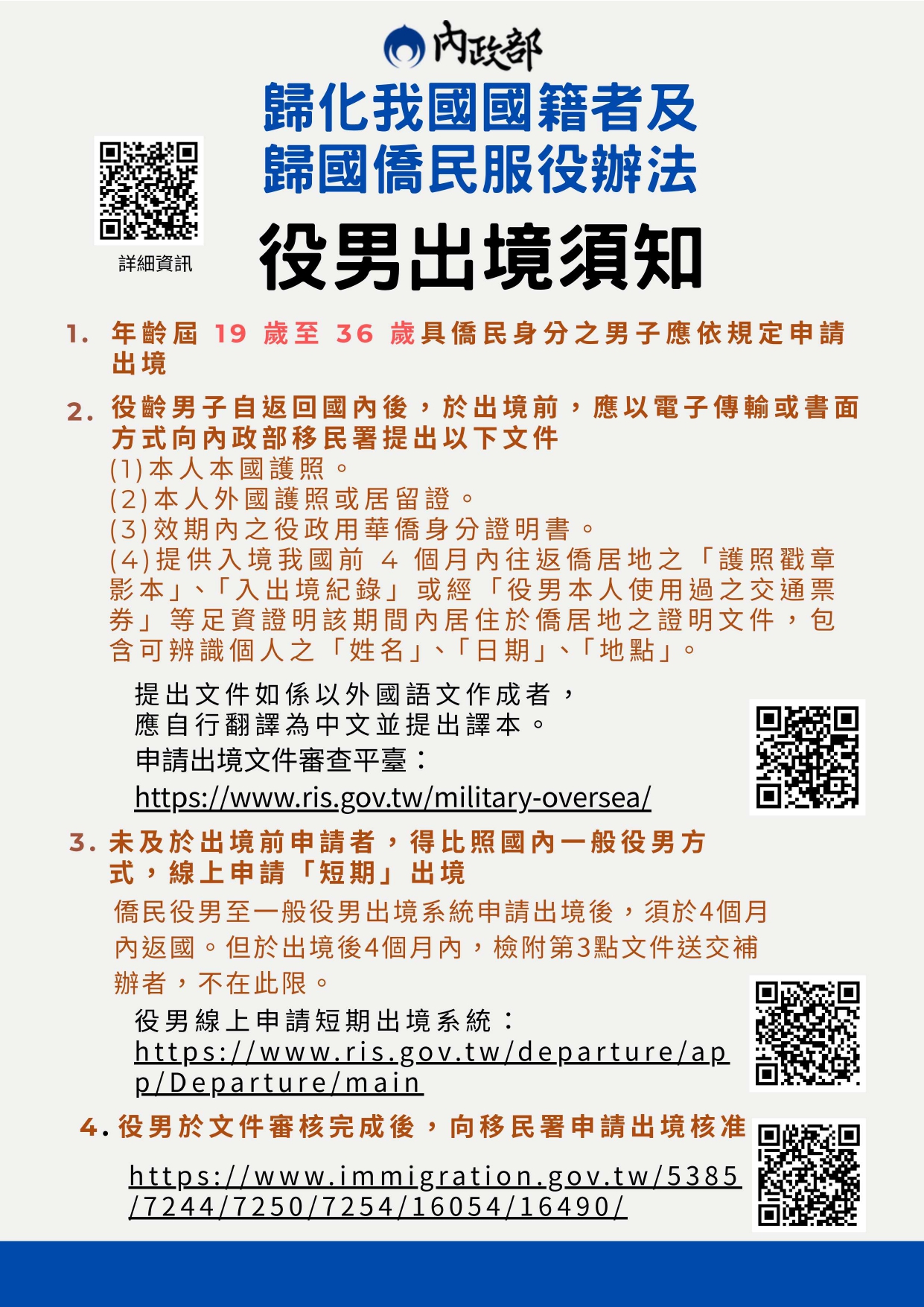 ※僑民役男申請出境文件審查平臺網址: https://occd.moi.gov.tw/app/oversea/