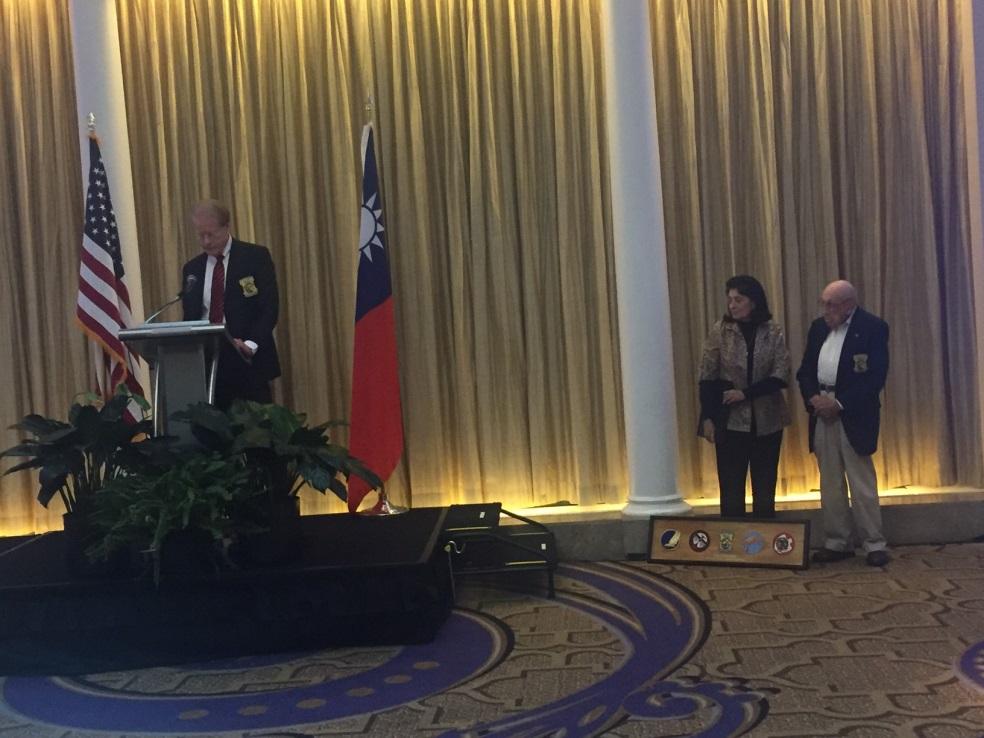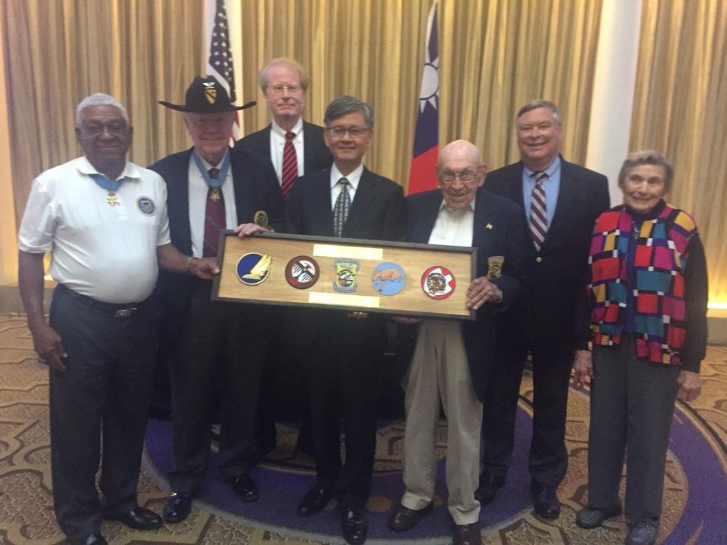 「杜立德空襲隊」唯一健在成員柯爾中校致贈裱框謝函及空襲隊成員所屬之隊徽紀念牌,感謝中華民國軍民於二戰期間之協助,由駐美國代表處李光章公使代表接受。