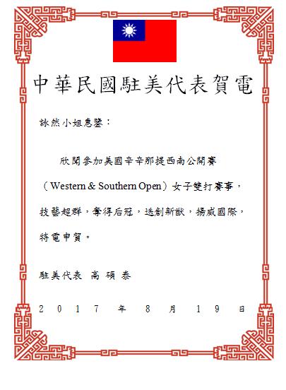 「欣聞參加美國辛辛那提西南公開賽(Western & Southern Open)女子雙打賽事,技藝超群,奪得后冠,迭創新猷,揚威國際,特電申賀。」