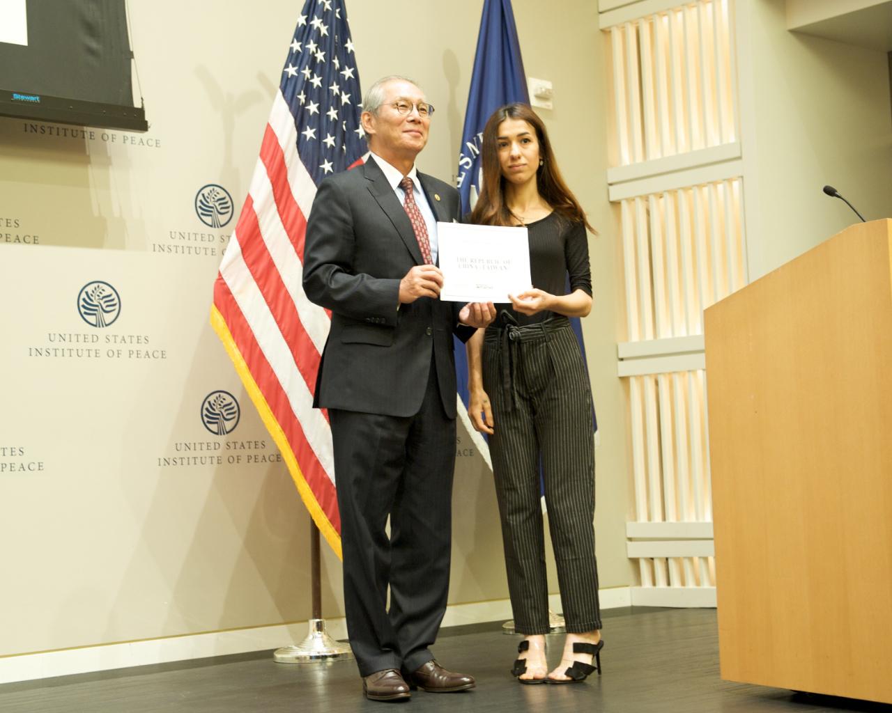 Taiwan’s Representative to the United States, Ambassador Stanley Kao, joined by 2018 Nobel Peace Prize laureate Nadia Murad, State Department officials Ambassador Kelley Currie (Office of Global Criminal Justice) and Special Advisor Knox Thames (Office of International Religious Freedom), attended a public ceremony held at the United States Institute of Peace (USIP) on June 28th, 2019, to highlight Taiwan’s contribution towards the Global Coalition to Defeat ISIS’ humanitarian assistance and stabilization efforts by donating to “Nadia’s Initiative” to support humanitarian work in Iraq.
