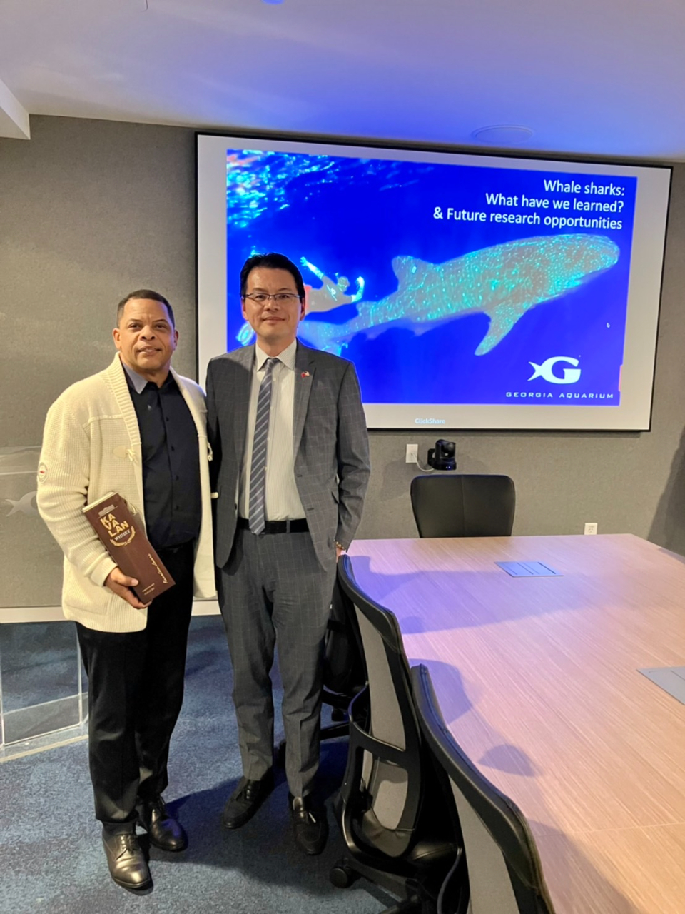 亞特蘭大辦事處2月28日受邀拜訪全球規模第三大的喬治亞水族館,喬治亞水族館是亞洲區以外唯一擁有鯨鯊(Whale Sharks)的水族館,在2012年之前,喬治亞水族館的規模曾是世界排名第一。喬治亞水族館館長 Brian Davis博士向王翼龍處長表示水族館與臺灣是協力保育鯨鯊的長期研究夥伴,除了感謝臺灣自開館來提供數隻鯨鯊供展示暨研究,更表示已與臺灣相關機構規劃了長期合作計畫。會後,王處長致贈Brian Davis博士來自臺灣的葛瑪蘭威士忌,並表示亞特蘭大辦事處非常樂意支持喬治亞水族館,為海洋動物保育盡一份心力。