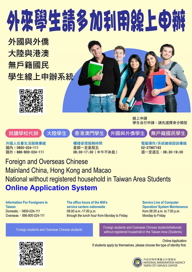 內政部移民署為提供外國與外僑人士來臺就讀專科以上學校之學生,在駐外館處辦好居留簽證入境後至內政部移民署學生自行線上申辦及發證系統申請居留證。