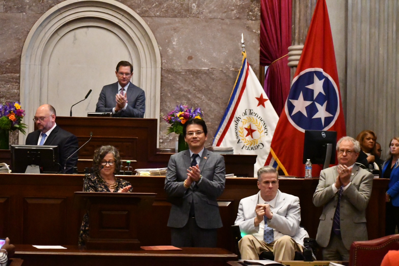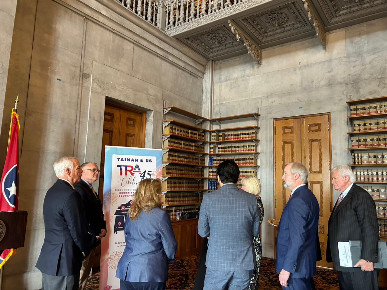 本處王處長於4月15日受邀至田納西州眾議會演講,並於演講中強調今年是台灣關係法立法45週年,台美將在教育、經貿、文化與安全等領域建立更緊密關係。演講獲全場支持掌聲,並與全體眾議會台灣連線成員合影! 同日本處並於田納西州議會舉辦立法45週年慶祝會,包括四位台灣連線共同主席及約30位參、眾議員出席!