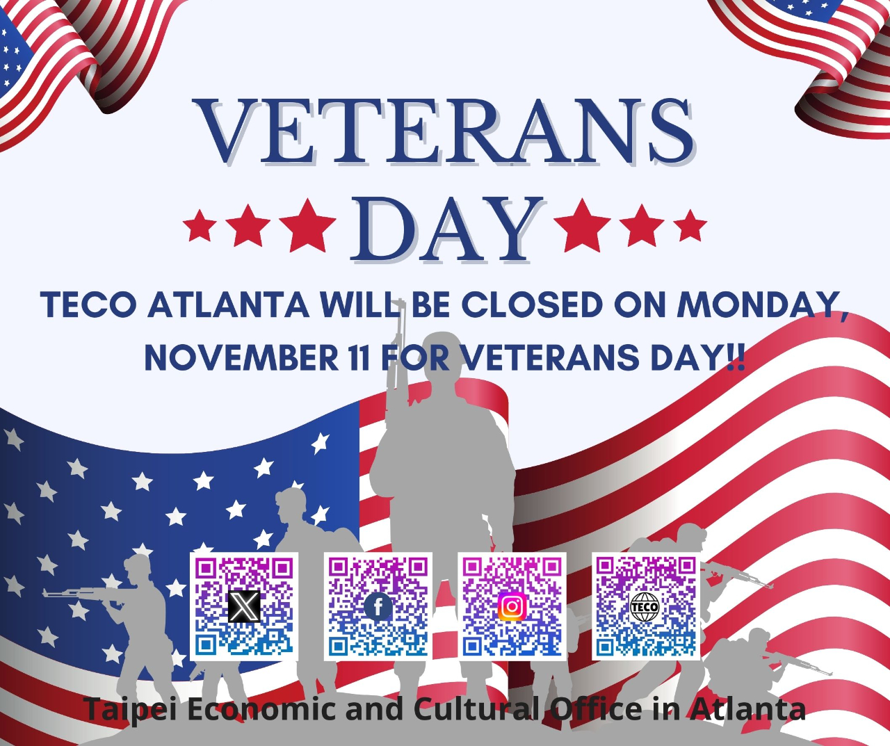 駐亞特蘭大台北經濟文化辦事處配合美國退伍軍人節國定假日,將於2024年11月11日(星期一)暫停對外服務乙日。倘於前述假日遇有重大急難事件需緊急協助,請撥打本處緊急聯絡電話: 404-358-3875。