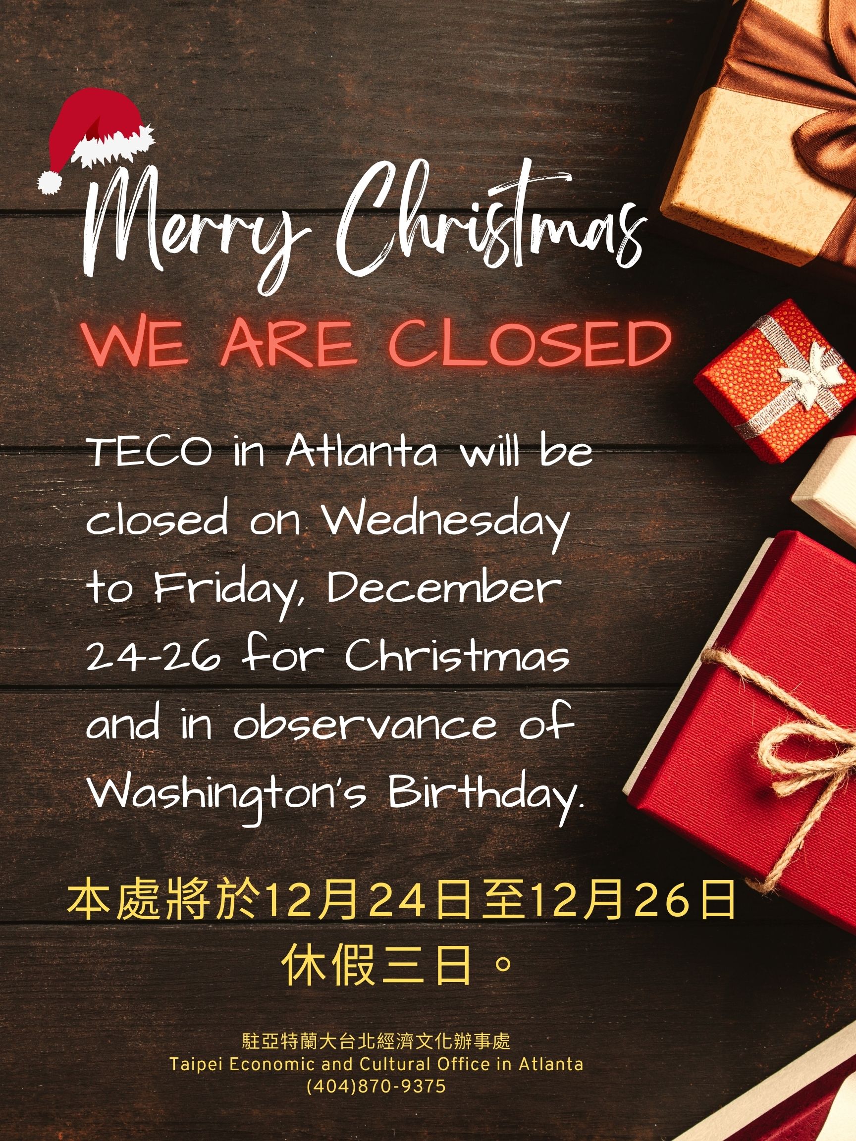 美國聖誕節連續假日,駐亞特蘭大台北經濟文化辦事處將於2025年12月24日至26日(星期三至... - 駐亞特蘭大台北經濟文化辦事處 Taipei Economic and Cultural Office in Atlanta ::: 跳到主要內容區塊