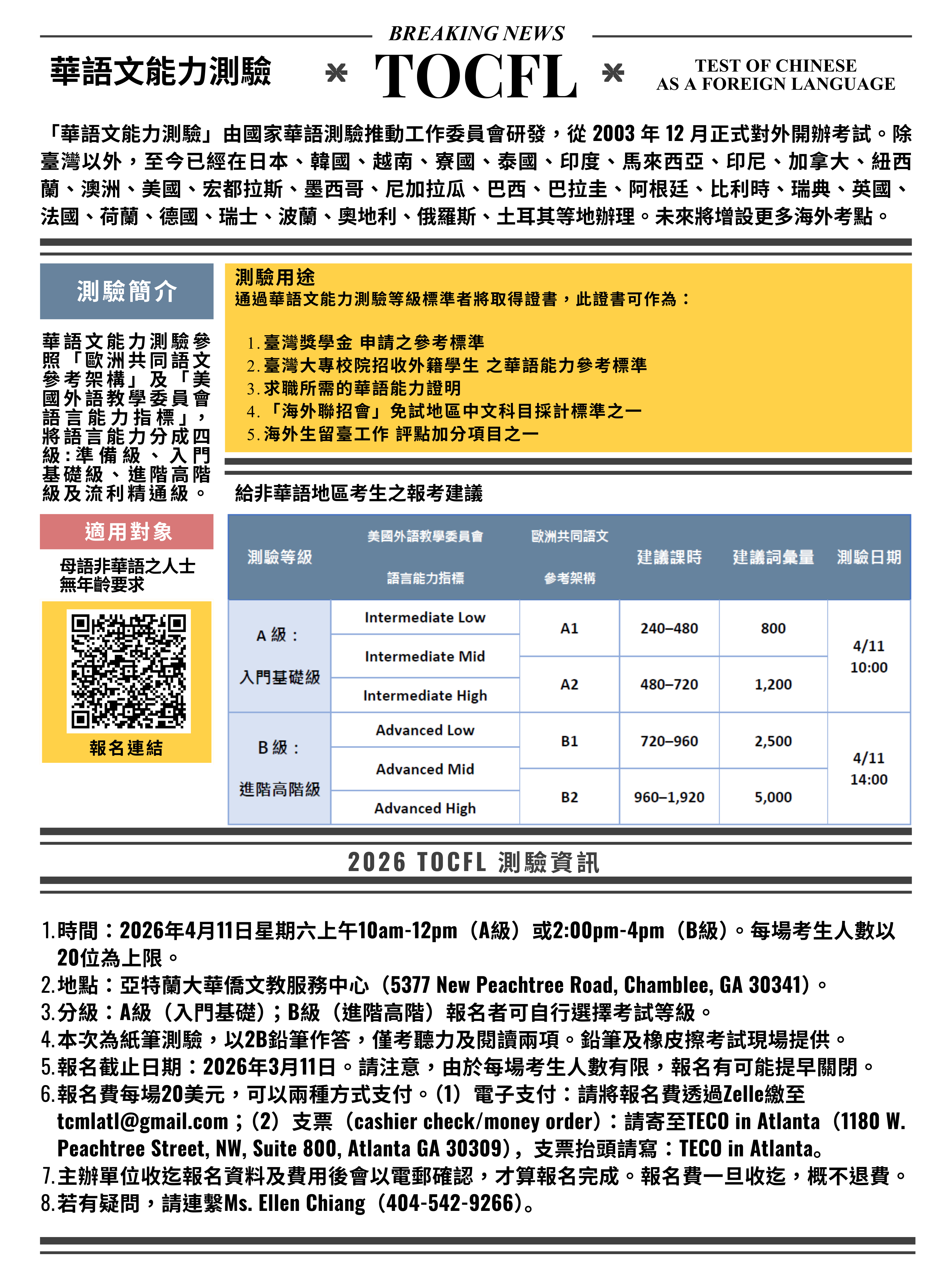 2026年上半年亞特蘭大地區華語文能力測驗即日起開始報名,歡迎踴躍報考 - 駐亞特蘭大台北經濟文化辦事處 Taipei Economic and Cultural Office in Atlanta ::: 跳到主要內容區塊