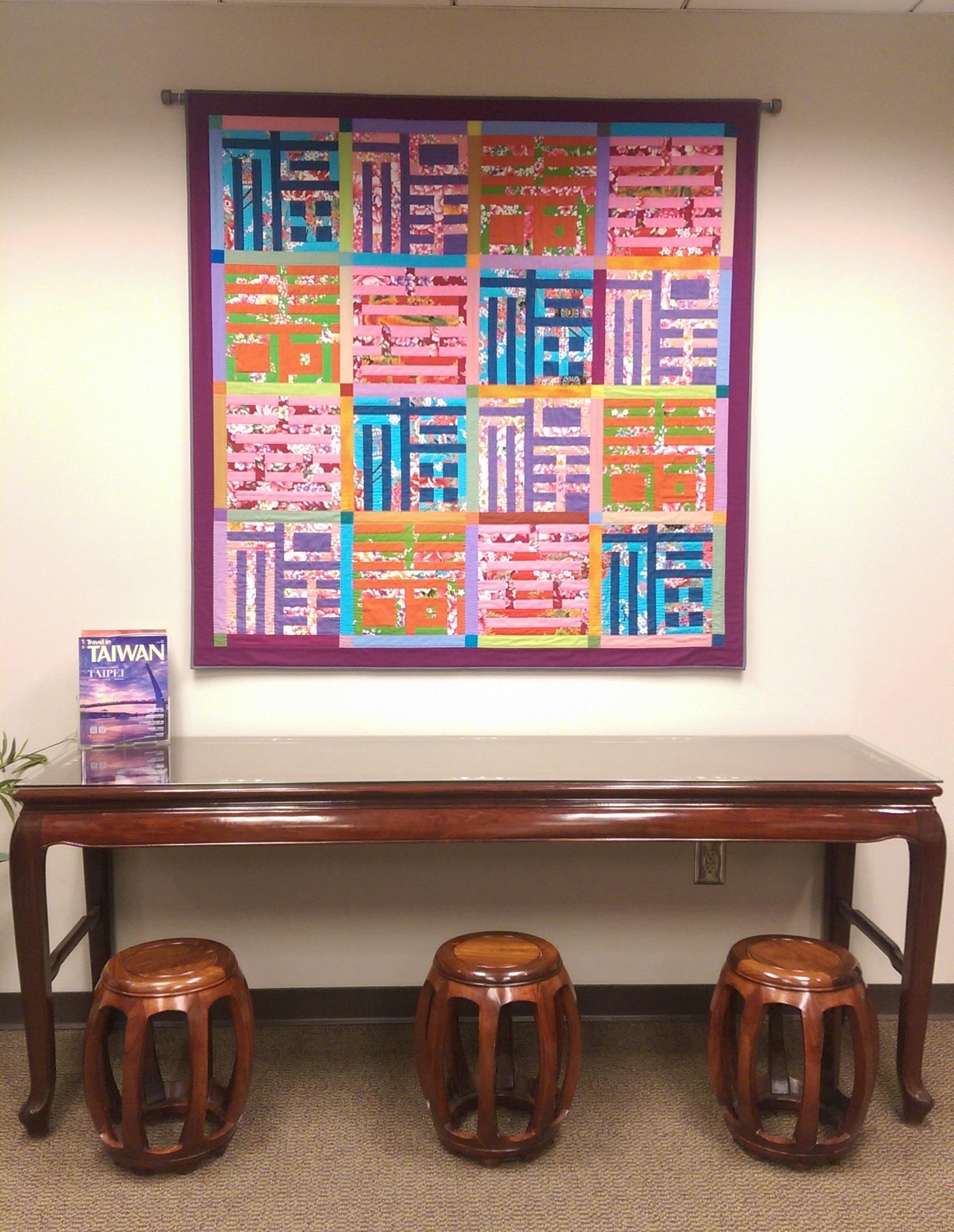 此件作品是于教授運用從台灣帶來的客家花布,結合在美國蔚為風行的拼布技巧所創作而成,在16個區塊以幾何意象的「福」、「祿」、「壽」及「喜」文字表達祝福之意。劉處長對於于教授為辦事處量身訂做此一藝術創作表達感謝,駐亞特蘭大台北經濟文化辦事處為中華民國政府在美國東南地區的代表單位,未來將藉由展示此一具台灣特色的文創作品,向前來辦事處拜會洽公的美國人士及僑胞介紹台灣文化。
