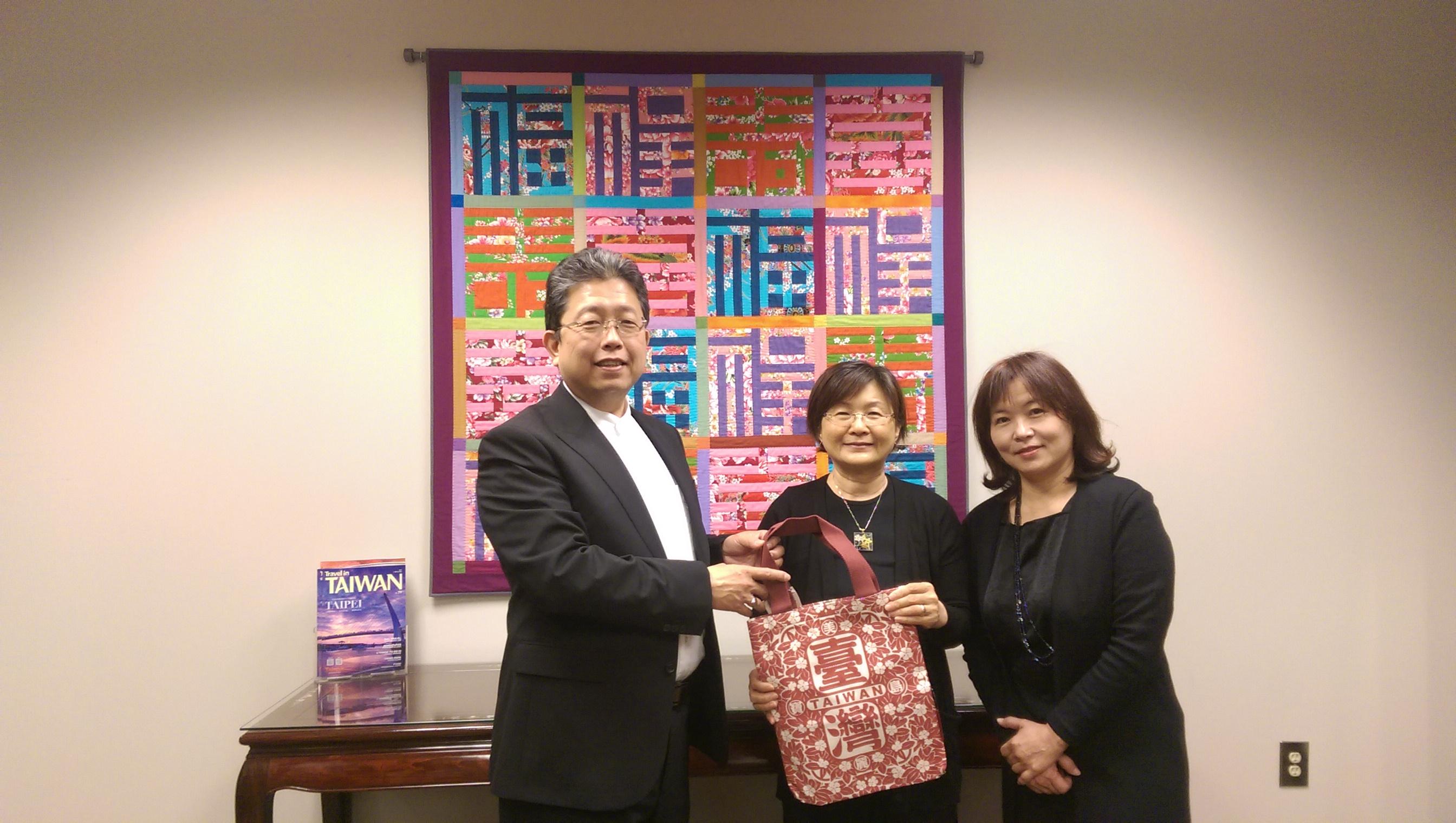 旅居美國北卡羅萊納州夏樂市(Charlotte)的台灣織品設計師于範教授本(28)日拜會駐亞特蘭大台北經濟文化辦事處劉經巖處長,並致贈所創作的福祿壽喜拼布(quilt)藝術作品,供辦事處在領務大廳懸掛展示。