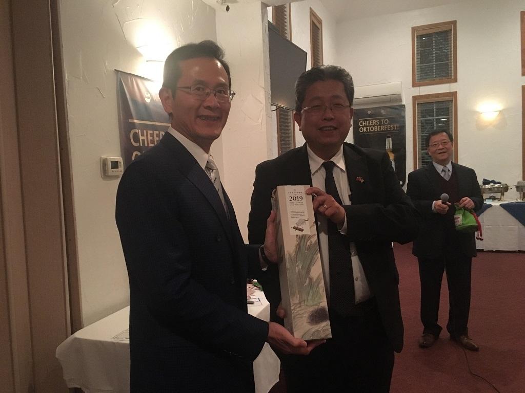 駐亞特蘭大台北經濟文化辦事處劉經巖處長偕張家華副組長於107年11月30日晚間應邀參加北卡羅萊納州台商永光化學年終感恩餐會,受到永光化學台灣總公司陳偉望總經理、美國分公司陳建銘總經理及員工的熱誠歡迎接待。 劉處長表示,招商引資及經貿諮商功能,與國內共拼經濟為辦事處工作重點,永光化學引進尖端染色色料及技術,結合製造機能性布料之台商宏遠紡織及製造先進紡織機械之台商佰龍機械,共同振興北卡傳統之紡織業,活絡美國經濟,受到北卡州各級政府之歡迎與重視,共創台美互惠互利之商機,均為台商楷模。 永光化學陳總經理致詞時感謝劉處長遠從亞特蘭大前來參與年度之年終感恩餐會,關懷企業經營、台籍幹部及員工生活情形,永光化學深入服務台灣社區,尤其北卡夏樂台灣同鄉會歷任會長均由永光化學員工榮任實為例證。 節目在歡樂互動氣氛中進行,劉處長提供摸彩品讓員工大為欣喜,另致贈陳總經理故宮發行之年曆祝賀生意興隆。