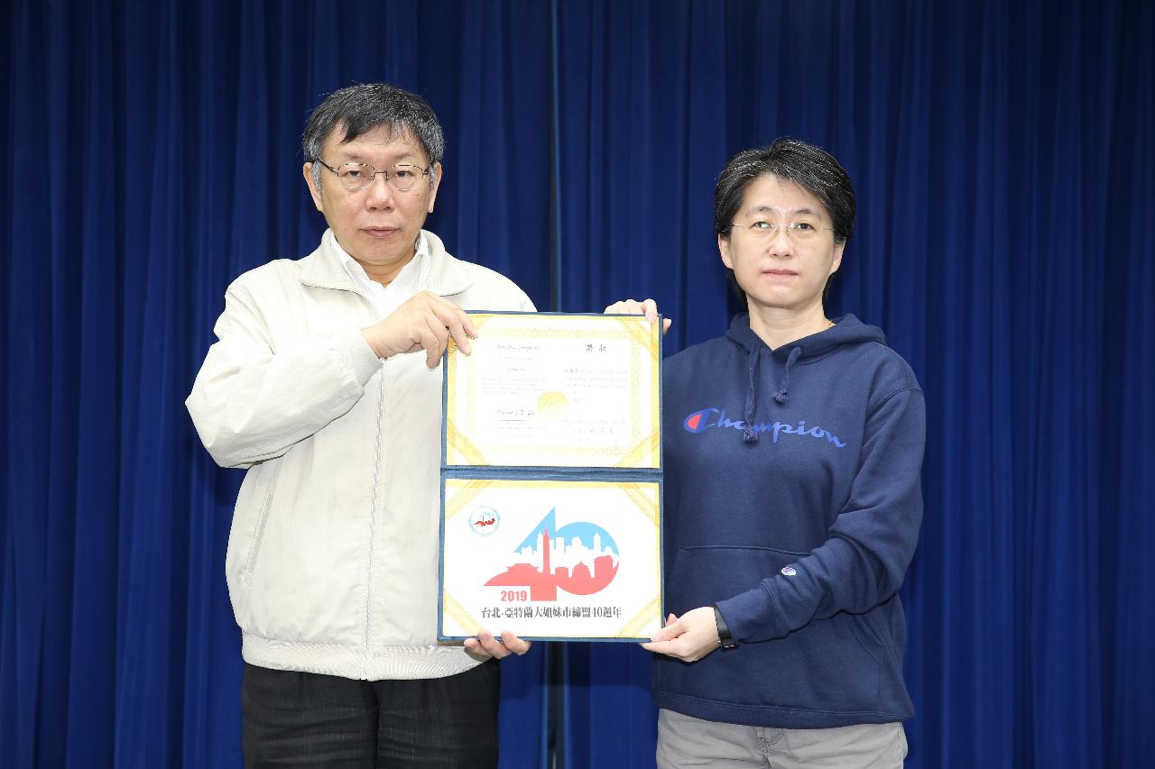 台北市市長柯文哲於市政會議中親自頒獎予首獎得獎人徐惠菁女士 (照片出處:台北市政府提供)