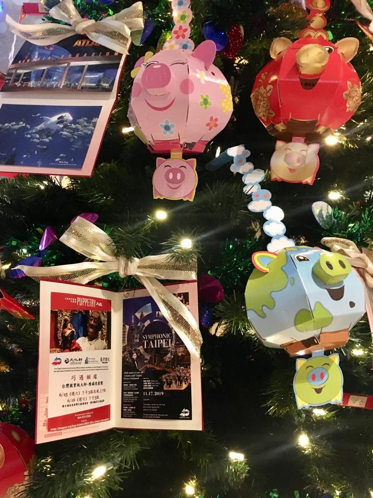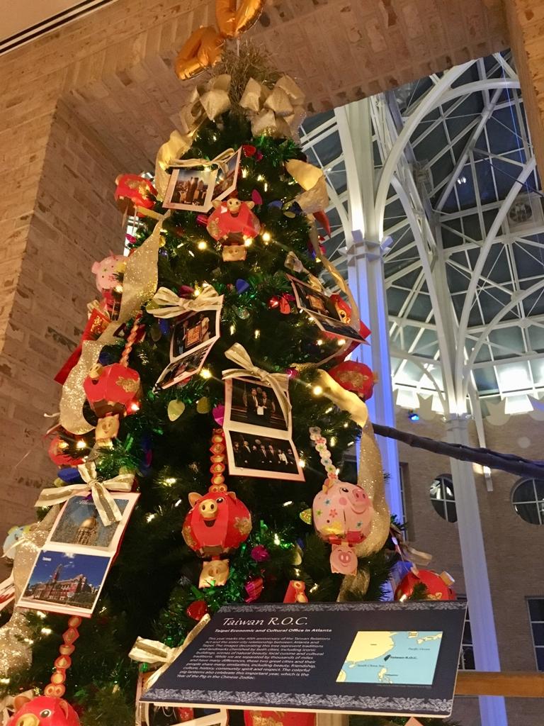 駐亞特蘭大台北經濟文化辦事處運用包括臺北市長柯文哲一行訪問亞特蘭大、國寶級大師陳錫煌偶戲團亞城演出、臺北市立交響樂團慶祝姊妹市四十週年亞城音樂會等系列慶祝活動照片及臺灣與亞特蘭大著名景點明信片,搭配今年金豬生肖燈籠,揉合臺灣喜慶文化,佈置具臺灣特色的聖誕樹,祝福臺美兩國國運昌隆。該博物館以「Taiwan R. O. C.」標示介紹我國。