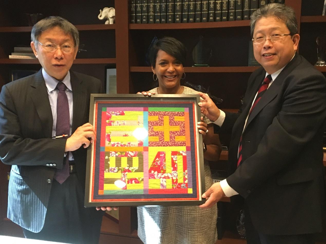 Mayor Ko and Director General Liu presented Taipei-Atlanta Sister Cityhood 40th anniversary quilt to Mayor Bottoms.