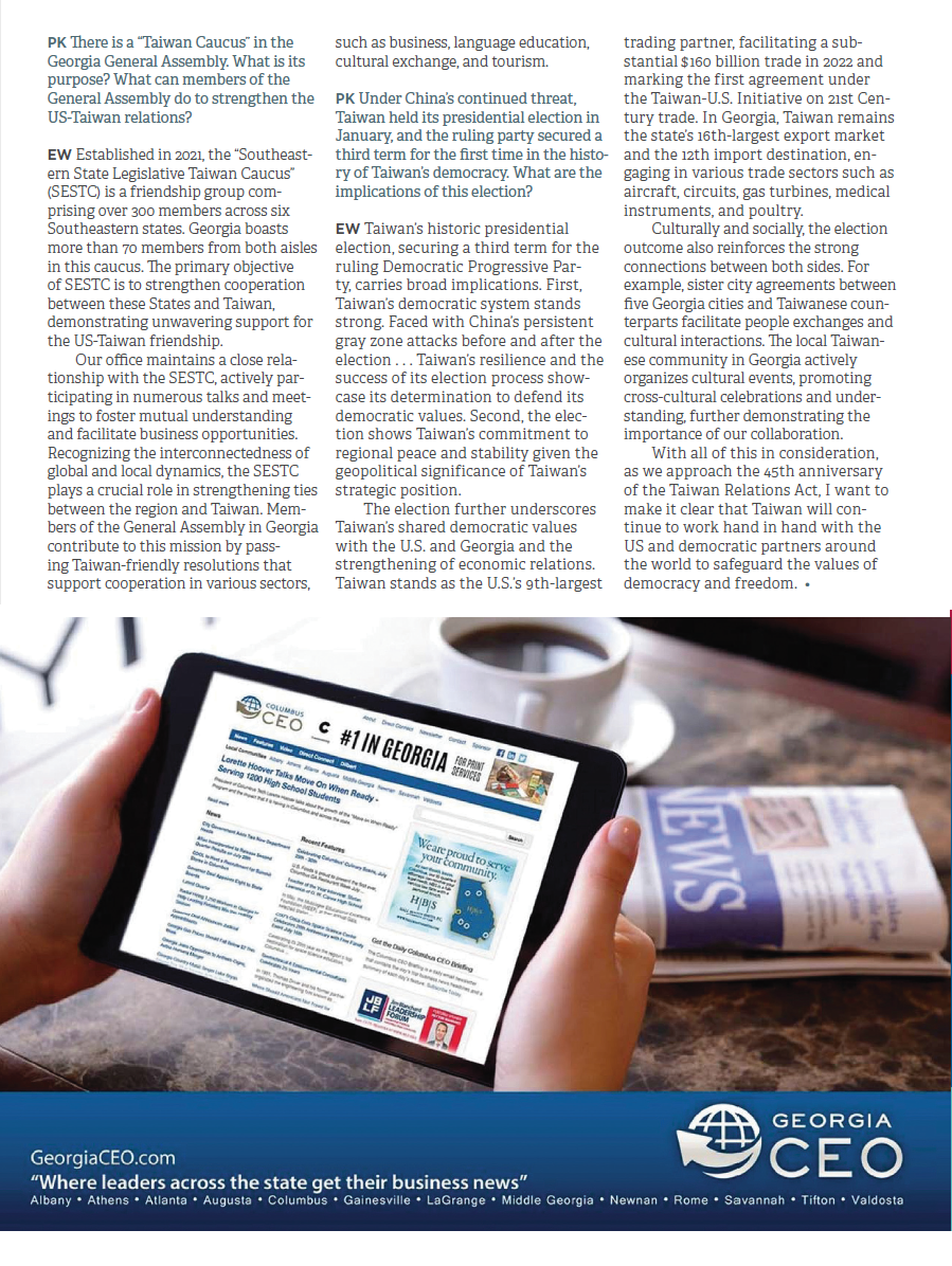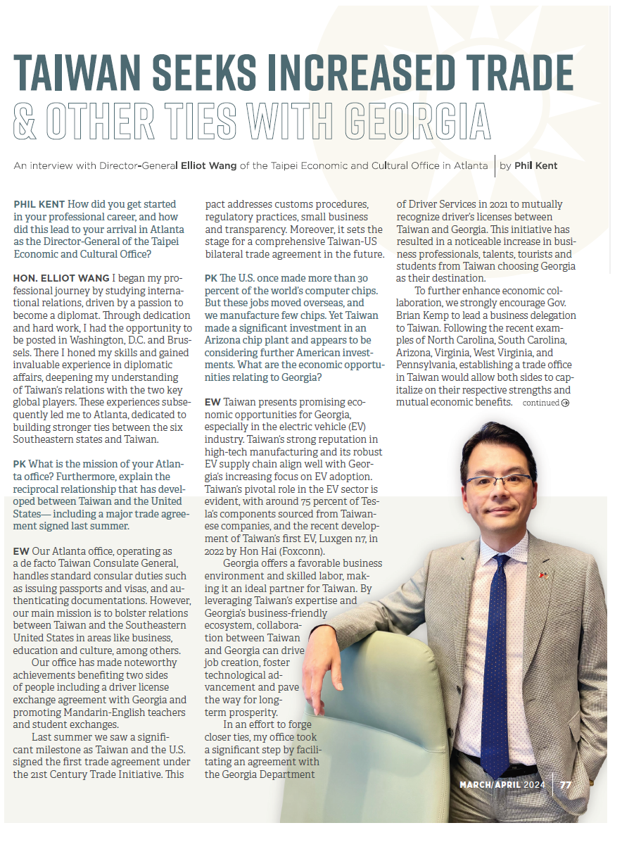 This is the first time, we have arranged for James Magazine CEO Phil Kent to interview Director-General Elliot Wang. The title is "Taiwan Seeks Increased Trade & Other Ties with Georgia." Published in the bimonthly magazine in March and April.