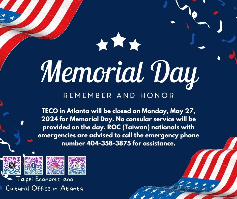 TECO Atlanta Memorial Day closed - Taipei Economic and Cultural Office in Atlanta 駐亞特蘭大台北經濟文化辦事處 ::: Skip to main content