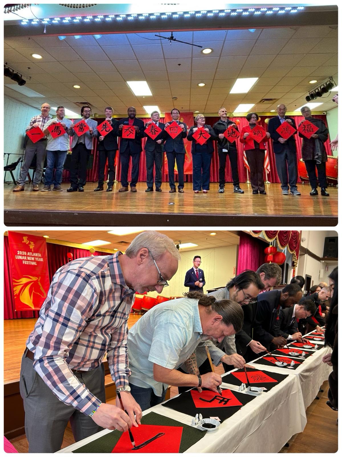 上午開幕典禮由臺美學校擊鼓及精彩民俗舞蹈揭開序幕。活動召集人陸復泰僑務委員、林主恩處長,以及喬州州參議員 Michael Rhett、眾議員 Karen Lupton、Chamblee City市長 Brian Mock 等貴賓相繼致詞向現場民眾拜年。林處長致詞時向僑界及來賓祝賀新年快樂、馬年行大運。他表示,十二生肖中的馬象徵速度與行動力,祝福大家「馬上發財、馬上健康、馬上快樂」,並期許新的一年人人如駿馬般充滿能量與活力。今年並特別邀請主流貴賓共同揮毫,書寫「一馬當先行春回大地納鴻福」,為活動增添文化雅趣與新春祝福。
