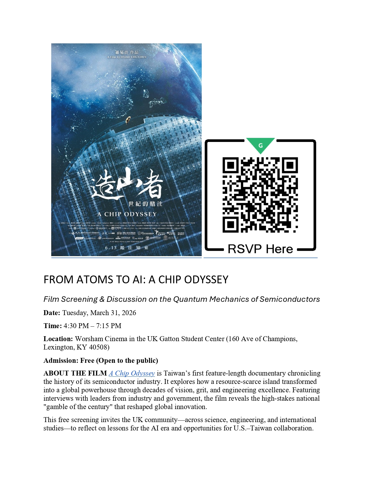 In partnership with the University of Kentucky and the Taiwanese Association of M. Kentucky, TECO in ATL will screen A CHIP ODYSSEY on March 31 from 4:30–7:15 PM at Worsham Cinema, Gatton Student Center, University of Kentucky.